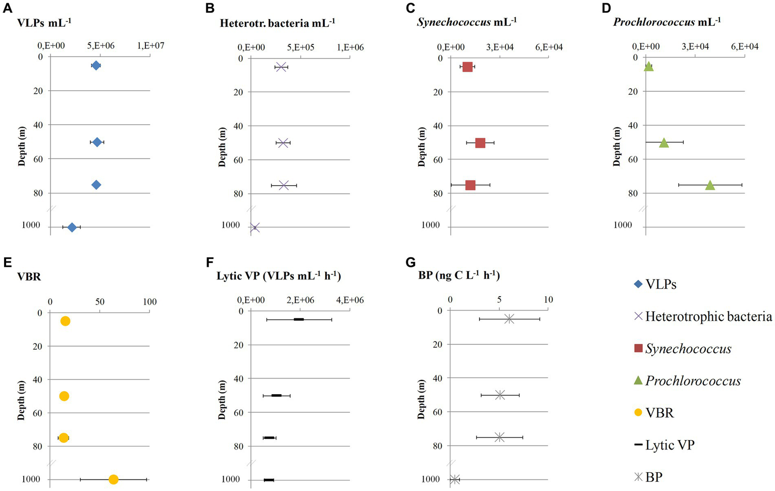 | Abundances: virus-like particles, heterotrophic and autotrophic bacteria | ||||