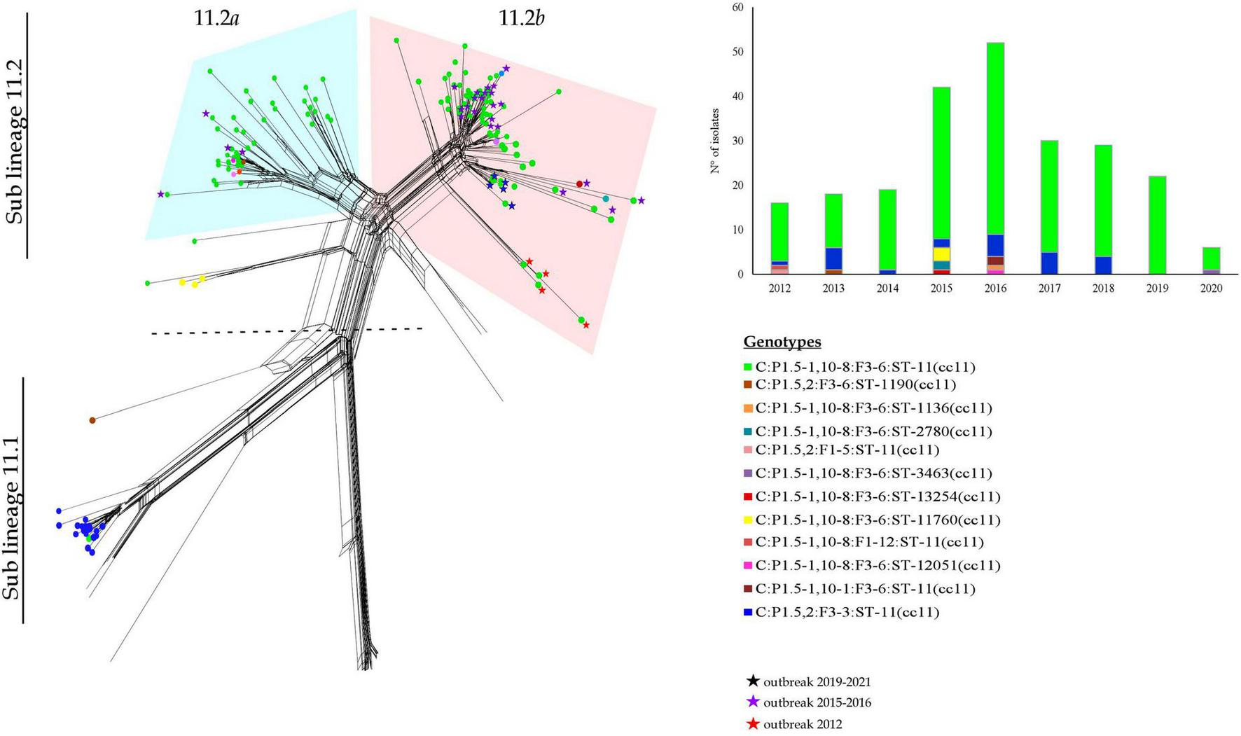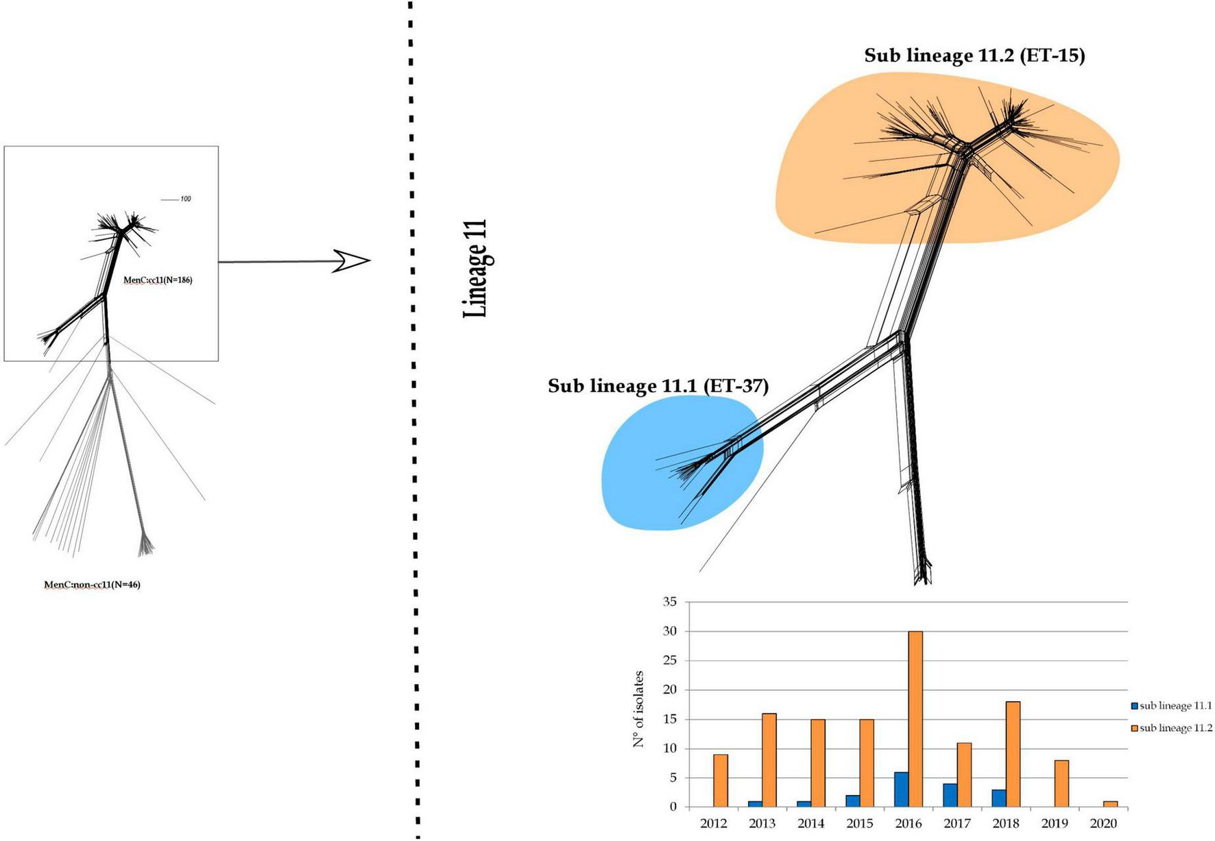 From 2000 to 2020, a total of 665 MenC isolates were investigated for antimicrobial susceptibility and 301 for genotyping. Over two decades, almost all MenC isolates resulted susceptible to antimicrobials with few isolates resulting resistant to ciprofloxacin (N = 2), penicillin G (N = 13), and rifampicin (N = 9), respectively. Molecular typing of MenC obtained from isolates or clinical specimens identified mostly the genotype C:P1.5-1,10-8:F3-6:ST-11(cc11). However, phylogenetic analysis, performed on genomes from MenC isolates, identified two sub lineages, 11.1 and 11.2, among cc11, of which the sub lineage 11.2 was the predominant.