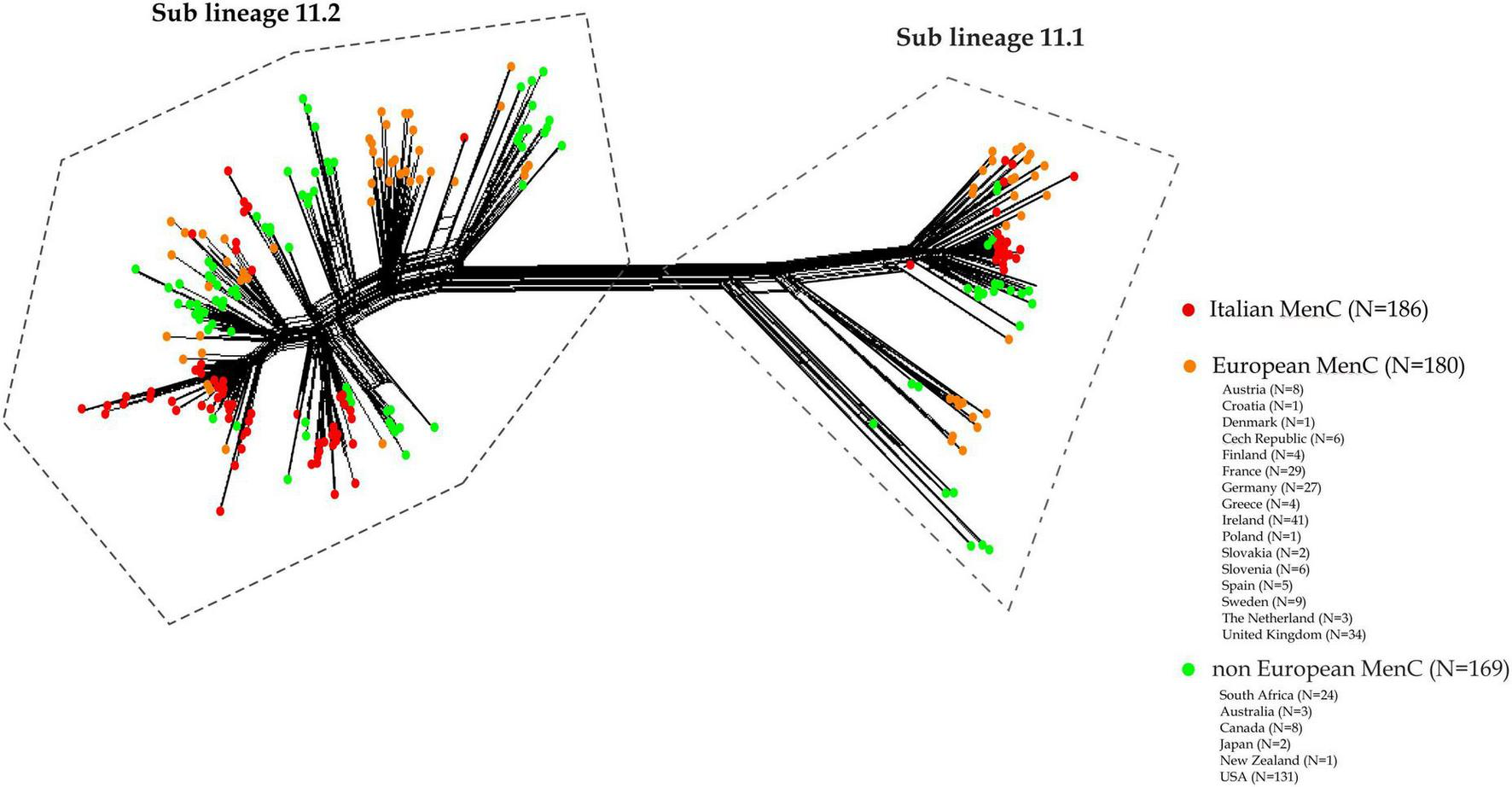 Genomic comparison was performed on meningococcal genomes collected between 2012 and 2020, using the Genome Comparator tool available on PubMLST.5 The resulting distance matrix was visualized as a Neighbor-Net network in Split Tree4 (version 4.13.1). Incomplete loci were automatically removed from the distance matrix calculation for the neighbor-net graphs. All genome sequences were submitted to PubMLST Neisseria database4 (see Supplementary Table 1 for the isolate details). Additionally, a subset of European and non-European genomes belonging to MenC:cc11 (accessible in the Neisseria PubMLST4) were used for comparison versus Italian MenC:cc11 genomes.