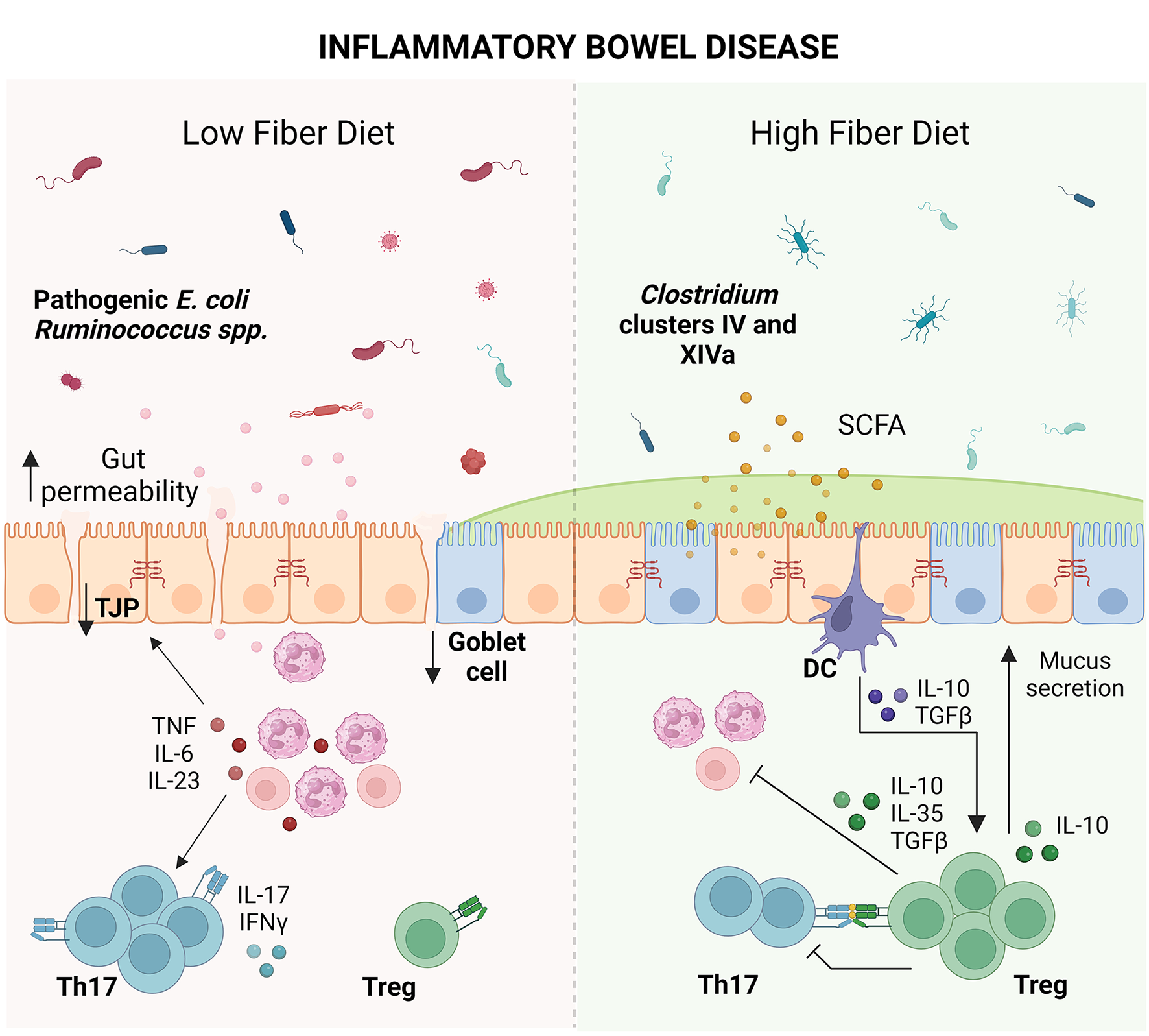 Impact of dietary fiber on inflammatory bowel disease (IBD). IBD coupled with a low fiber diet leads to microbial dysbiosis. Microbial antigens released into the intestinal milieu are recognized by immune cells, leading to immune activation and recruitment of T cells such as T helper (Th) 17 cells. Overproduction of inflammatory cytokines such as tumor necrosis factor (TNF), interleukin (IL)-6, IL-23, IL-17, and interferon (IFN)-γ damages the epithelial barrier, leading to tight junction protein (TJP) loss, goblet cell loss, decreased mucus production and increased gut permeability. Elevated gut permeability perpetuates microbial exposure and immune activation, leading to chronic inflammation and tissue damage. Conversely, consumption of dietary fiber leads to the expansion of short-chain fatty acid (SCFA)-producing bacteria from the Clostridium clusters IV and XIVa. SCFAs strengthen the gut barrier by serving as fuel to colonocytes and tolerize dendritic cells (DCs), leading to production of anti-inflammatory cytokines such as IL-10 and transforming growth factor-β (TGFβ). These cytokines promote the growth of T regulatory cells (Tregs) which dampen inflammatory cells as well as promote goblet cell function and mucus secretion, providing an opportunity for reconstitution of the epithelial barrier (Created with BioRender.com).