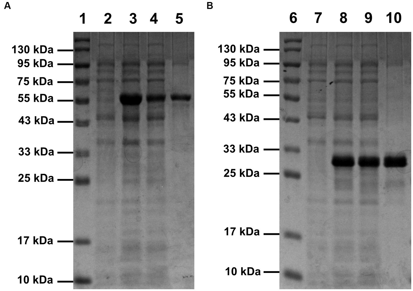 SDS-PAGE analysis of rSrocXyn10-Ec (A) and rBvelXyn11-Ec (B). The recombinant enzymes were one-step purified using Ni2+-affinity chromatography. Lanes 1 and 6, protein molecular weight maker; lanes 2 and 7, cell of induced Escherichia coli Rosetta (DE3) harboring vector pET30a(+); lanes 3 and 8, cells of induced E. coli Rosetta (DE3) harboring plasmid pET30a(+)-SrocXyn10 and pET30a(+)-BvelXyn11; lanes 4 and 9, soluble intracellular protein of induced E. coli Rosetta (DE3) harboring plasmid pET30a(+)-SrocXyn10 and pET30a(+)-BvelXyn11; lanes 5 and 10, one-step purified rSrocXyn10-Ec and rBvelXyn11-Ec.