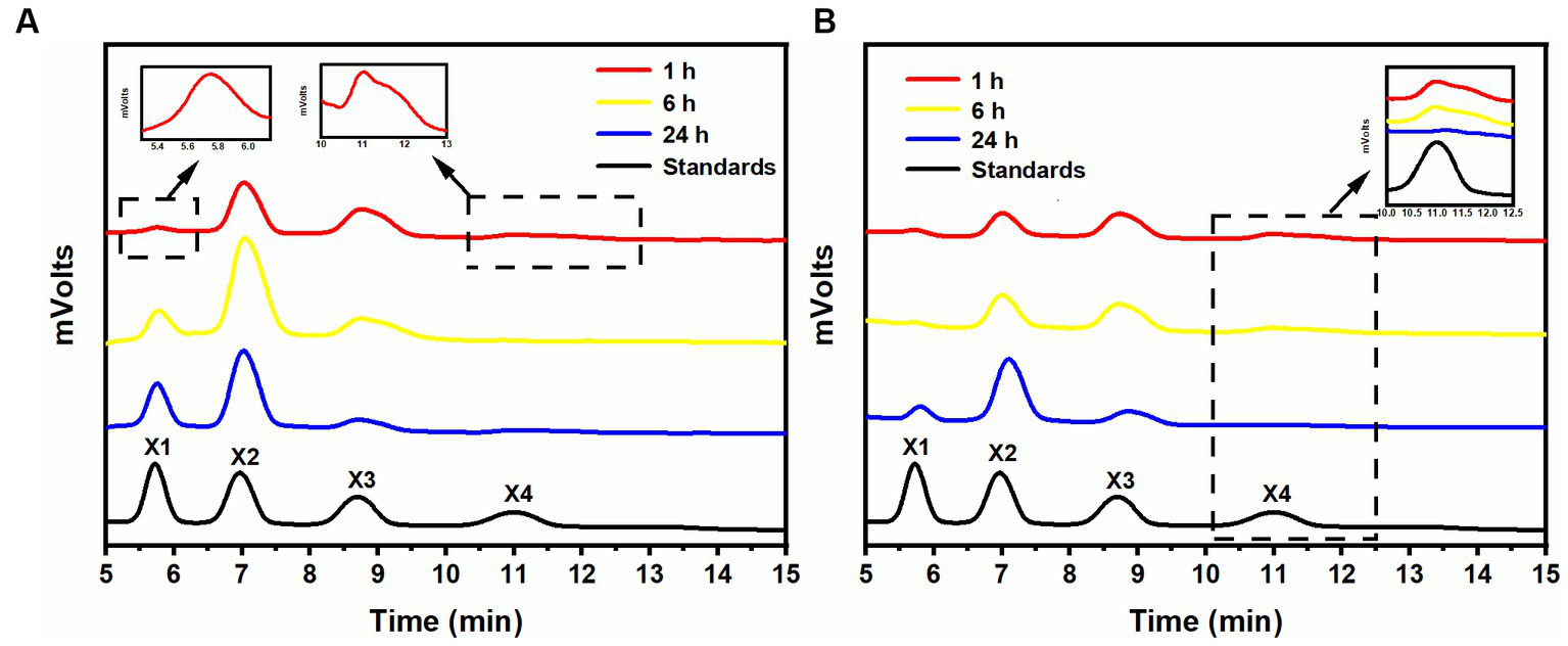 After a 1-h hydrolysis with rSrocXyn10-Ec, the main products were xylobiose and xylotriose, with a small amount of xylotetraose (Figure 2A). Extending the hydrolysis time to 6 h resulted in undetectable xylotetraose and production of xylose. After 24 h of hydrolysis, xylose, xylobiose, and xylotriose were found in the hydrolysate. The hydrolysis behavior and products of rBvelXyn11-Ec (Figure 2B) were similar to those of rSrocXyn10-Ec. The proportion of XOSs in the hydrolysates of rSrocXyn10-Ec and rBvelXyn11-Ec were 73.94 and 89.50%, respectively.
