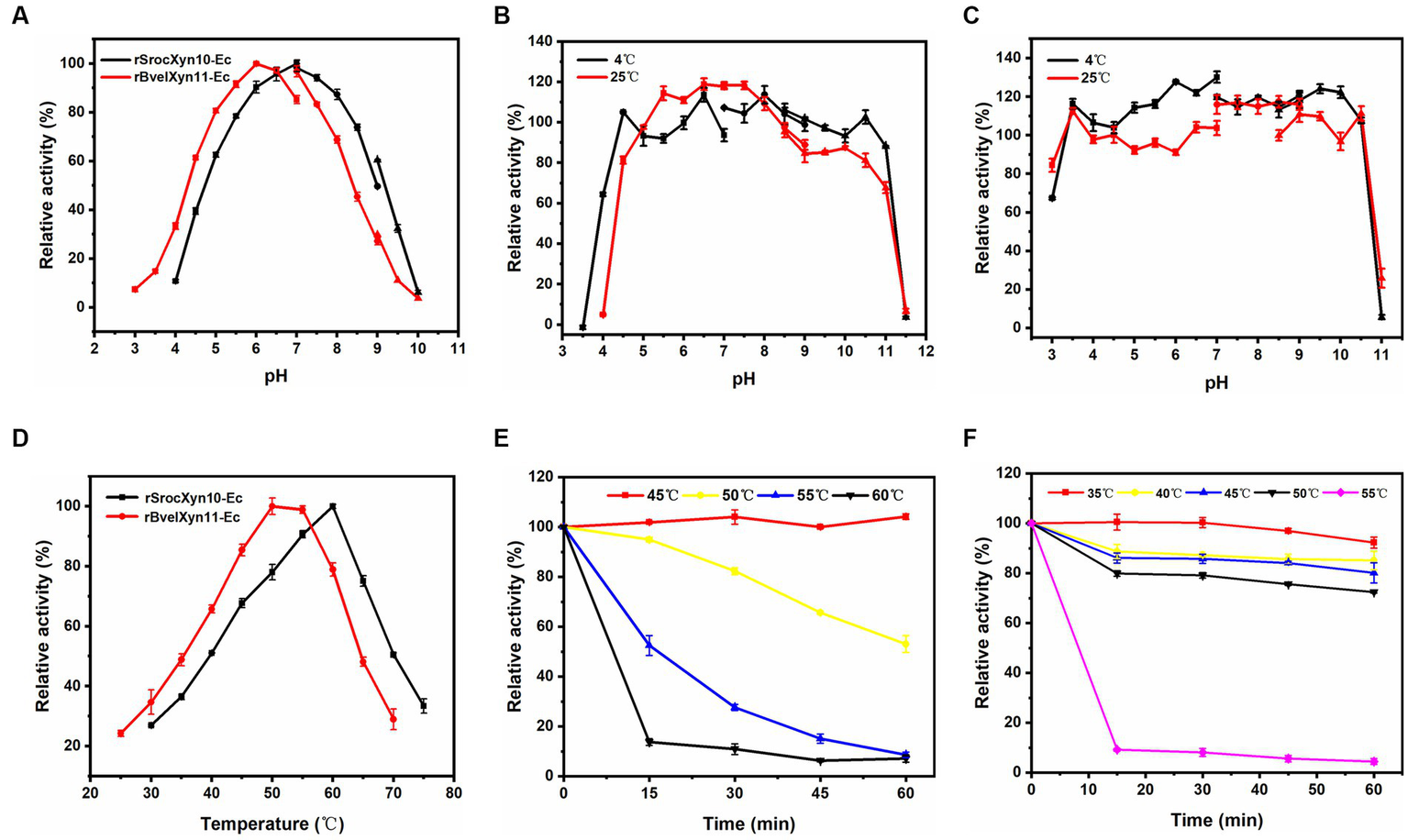 Effects of pH and temperature on activity and stability of rSrocXyn10-Ec and rBvelXyn11-Ec. (A) Effects of pH on enzyme activity of rSrocXyn10-Ec and rBvelXyn11-Ec. “■”: citric-Na2HPO4 (pH 3.0–7.0), “●”: Tris–HCl (pH 7.0–9.0), “▲”: glycine-NaOH (pH 9.0–10.0). (B and C) Effects of pH on enzyme stability of rSrocXyn10-Ec (B) and rBvelXyn11-Ec (C). “■”: citric-Na2HPO4 (pH 3.0–7.0), “●”: Tris–HCl (pH 7.0–9.0), “▲”: glycine-NaOH (pH 8.5–11.5). (D) Effects of temperature on enzyme activity of rSrocXyn10-Ec and rBvelXyn11-Ec. (E,F) Effects of temperature on enzyme stability of rSrocXyn10-Ec (E) and rBvelXyn11-Ec (F).