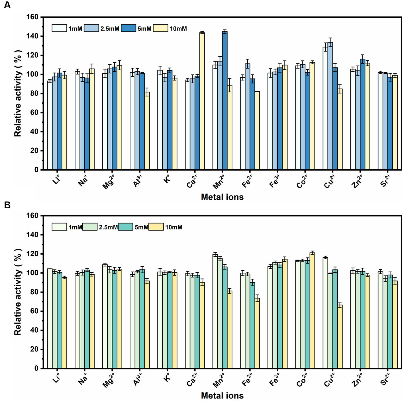 Effect of various metallic cations. Effect of various metallic cations on rSrocXyn10-Ec (A) and rBvelXyn11-Ec (B).