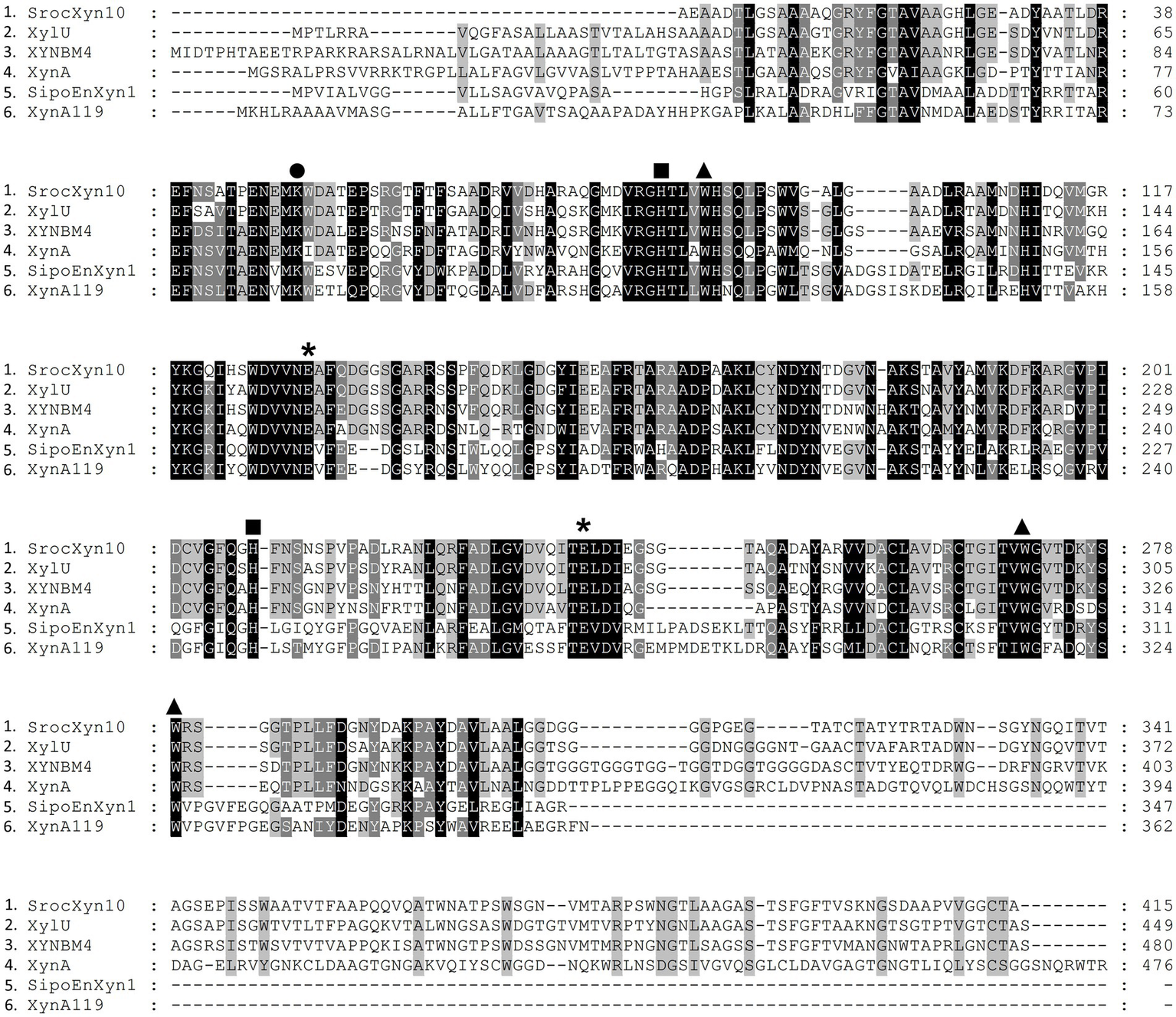 Alignment of the deduced amino acid sequence of rSrocXyn10-Ec from Streptomyces rochei with endo-xylanases from Streptomyces. XylU from S. mexicanus HY-14 (GenBank No: KM027334), XYNBM4 from S. megasporus DSM 41476 (GenBank No: HM003041), XynA from S. thermovulgaris TISTR1948 (GenBank No: LC088500), SipoEnXyn10A from S. ipomoeae 9103 (GenBank No: EKX62936), and XynA119 from Streptomyces sp. TN119 (GenBank No: ACR61563). Glu130 and Glu238, which were predicted to be catalytic amino acid residues, are marked by “*”. Trp87, Trp271, and Trp279, which were predicted to contribute to substrate binding, are marked by “▲”. His83 and His209, which were predicted to form hydrogen bond networks, are marked by “■”. Lys50, which was predicted to impact the Km value, is marked by “●”.