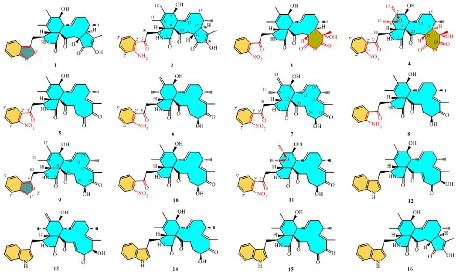 We put forward probable synthetic pathways for compounds 1–11, commencing from chaetoglobosin D, E, G, or Vb. The initial steps involve epoxidation to produce 2′, 3′-epoxy derivatives, which then undergo ring-opening reactions, followed by hydrolysis, to deliver the amino group (1′-NH2) derivatives (2, 6, 8). The next stage of the process involves the further oxidation of the aforementioned amino group (1′-NH2) to yield 1′-NO2 derivatives, such as compounds 5, 7, 10, and 11. Subsequently, the amino group (1′-NH2) derivatives undergo another round of oxidation, which yields intermediates containing nitrene. These then undergo hydrogenation and elimination reactions to generate compounds 1 and 9. This proposed synthetic pathway is illustrated in Scheme 1A.