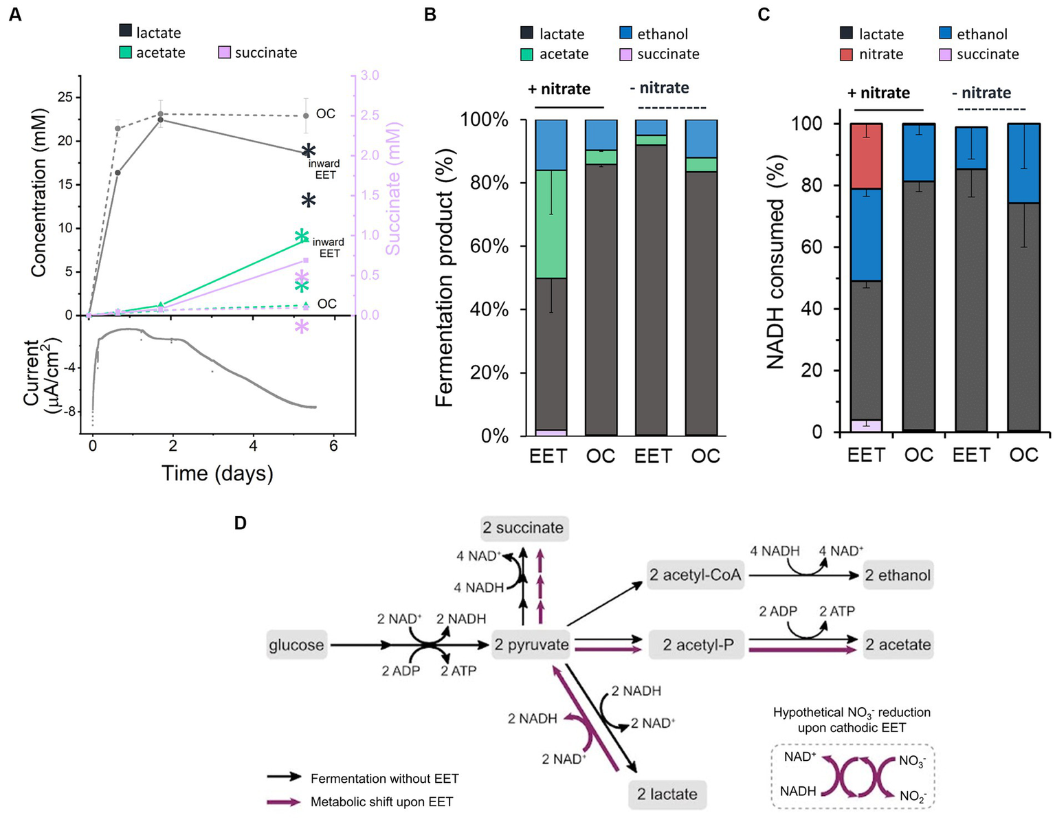 Figure 2. Impact of electron uptake on fermentative metabolism. (A) Evolution of metabolites under EET (continuous lines) and OC conditions (dotted lines) in the presence of both nitrate and glucose. Current consumption is shown for 1 reactor representing the EET condition tested in triplicate. Lactate (grey) and acetate (green) are represented on the left-Y axis of the graph, while succinate (purple) on the right-Y axis. (B) Metabolites produced under EET and OC conditions in the presence and absence of nitrate by day 5. (C) Estimated fractions of NADH consumed over global NADH consumed from nitrate reduction and fermentation pathways leading to lactate, ethanol and succinate production under EET vs. OC conditions in the presence and absence of nitrate by day 5. (D) Proposed metabolic shift of glucose fermentation under EET vs. OC conditions. Black arrows indicate the metabolic pathways under OC and under EET conditions before electron uptake occurs. Purple arrows indicate the proposed metabolic pathways that are stimulated when electron uptake occurs. For all experiments, nitrate and glucose (10 mM) were already present in the medium at t = 0, ΔEcathode = −600 mVAg/AgCl,sat.KCl and the error bars indicate the standard deviation from triplicate bioelectrochemical reactors. Significant differences were determined by one-way ANOVA with Dunn-Sidak post-hoc test (n = 3), ** p ≤ 0.01.