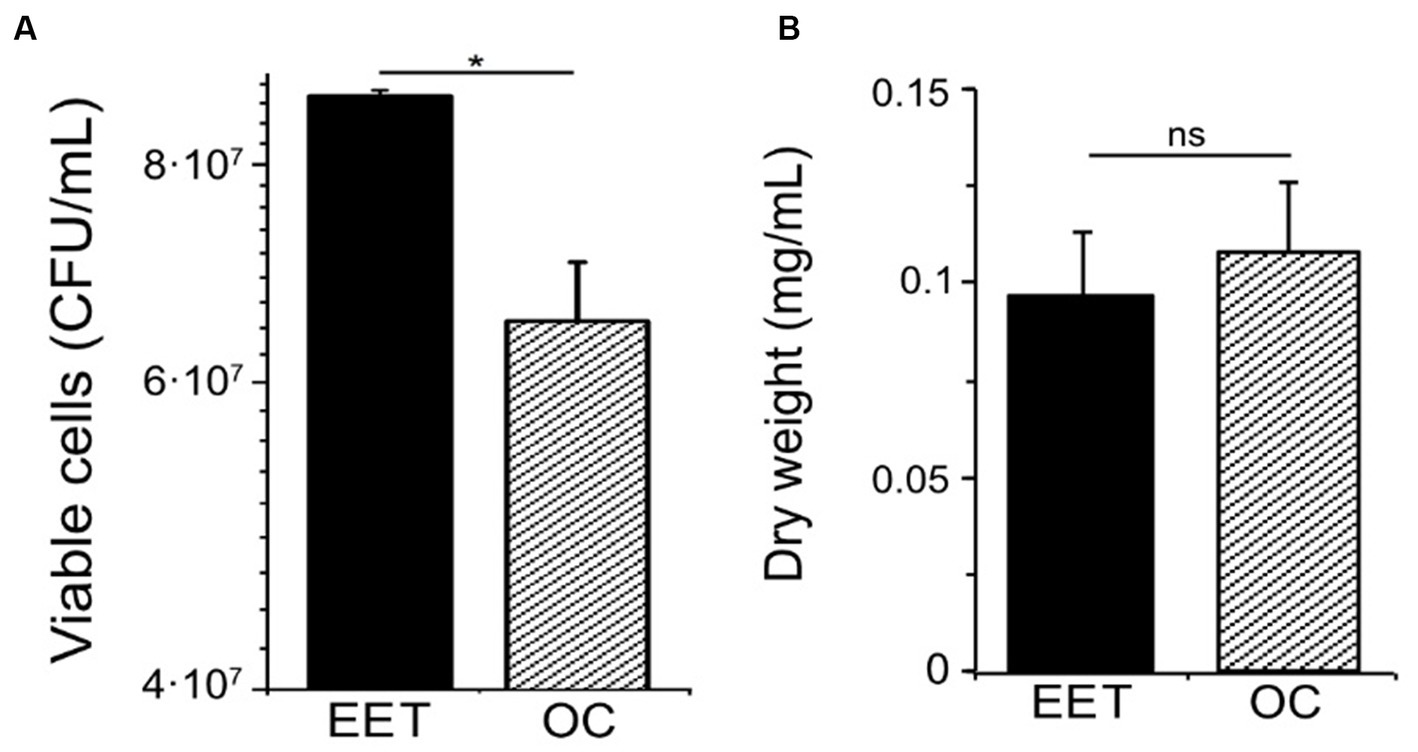 Figure 3. Impact of electron uptake impact on cell viability and final biomass in L. plantarum. (A) Cell viability at day 2 and (B) final biomass (dry weight) (day ∼5) for both electron uptake (EET) and OC conditions. For all experiments, nitrate (10 mM) and glucose (5 mM) were already present in the medium when the electrodes were polarized (ΔEcathode = −600 mVAg/AgCl, sat. KCl), and the error bars indicate the standard deviation from three replicates. Significant differences in iron reduction were determined by one-way ANOVA with Dunn-Sidak post-hoc test (n = 3), * p ≤ 0.05.