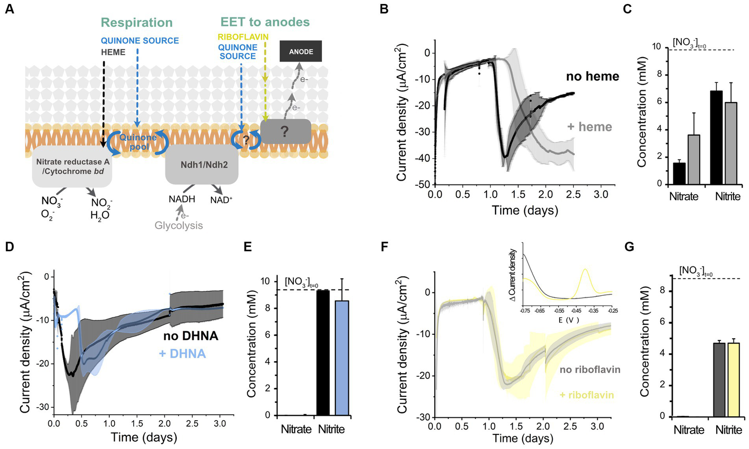 Figure 4. Effect of different electron transport cofactors on L. plantarum electron uptake. (A) Schematic of the known electron transport chains in L. plantarum associated with aerobic respiration, anaerobic respiration, and EET to anodes, showing the cofactors required for the activation of each electron transport chain. (B,C) Effect of heme supplementation on current density consumption (B) and nitrate and nitrite levels (C) under cathodic EET conditions. (D,E) Effect of the supplementation of the quinone synthesis precursor DHNA on current density consumption (D) and nitrate and nitrite levels (E). (F,G) Effect of riboflavin on current density consumption (F) and nitrate and nitrite levels (G). The inset in (F) shows the voltammogram obtained from a differential pulse voltammetry assay that confirmed the absence of flavins in the media (peak centered at ~ −0.4 V). For all experiments, nitrate (10 mM) and glucose (5 mM) were already present in the medium when the electrodes were polarized (ΔEcathode = −600 mVAg/AgCl, sat. KCl), and the error bars indicate the standard deviation from three replicates.