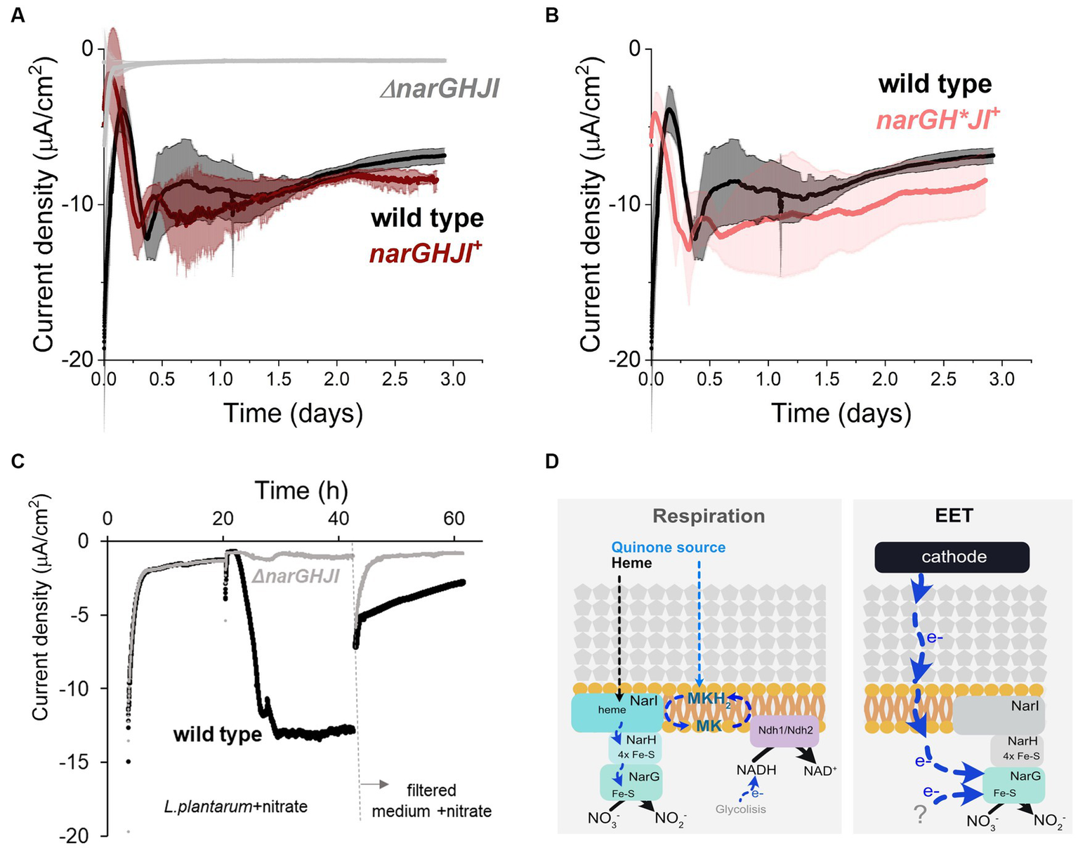 Role of nitrate reductase A in the cathodic current consumption. (A) Current density consumption of NCIMB8826 wild type strain compared to NCIMB8826 lacking the NarGHJI operon (ΔnarGHJI) and the complemented strain with the operon in the ΔnarGHJI background (narGHJI+). Comparison between wild type and ΔnarGHJI, and between wild type and narGHJI+ was performed in two independent assays. The plot shows current consumption of wild type in the second assay. (B) Current density consumption of NCIMB8826 wild type strain compared to NCIMB8826 expressing narGH*JI in the background of ΔnarGHJI with Cys > Ala mutations in all the three [4Fe-4S] clusters of narH. (C) Current density over time of wild type and the mutant ΔnarGHJI and current density of the filtered medium of the bioreactors (from 42 h) in a new BES. (D) Proposed mechanism of nitrate reduction and electron transport when electron donor (NADH from glycolysis) is in the cytoplasm (respiration) and proposed electron transport pathway when a cathode and a yet-unidentified molecules act as electron donors. For all experiments, nitrate (10 mM) and glucose (5 mM) were already present in the medium when the electrodes were polarized (ΔEcathode = −600 mVAg/AgCl, sat. KCl), and the error bars indicate the standard deviation from three replicates.