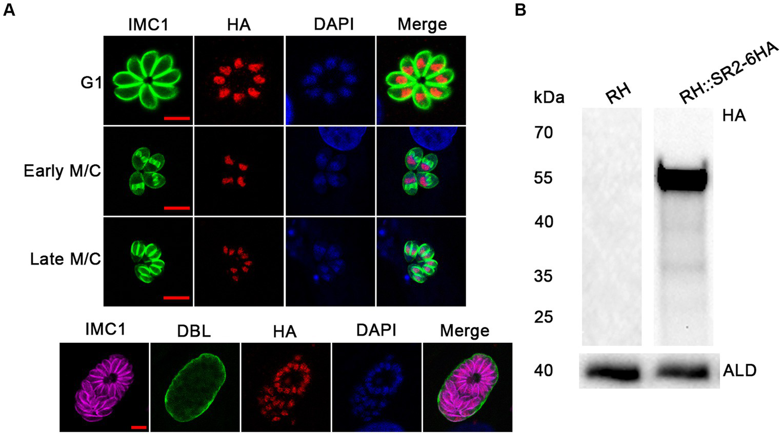 Subcellular localization and expression of SR2 in T. gondii. (A) Subcellular localization of SR2 in tachyzoites and bradyzoites. Rabbit anti-IMC1, mouse anti-HA and DAPI were used to stain the inner membrane complex (green), localize the tagged protein (red) and stain the nucleus (blue), respectively. Scale bars, 5 μm. IFA showed that SR2 in tachyzoites and bradyzoites was localized to the nucleus. (B) Western blotting confirmed the correct expression of SR2 coding region fused with 6HA tag as evidence by detection of a ~ 52 kDa band. Anti-aldolase (ALD) was regarded as a loading control.