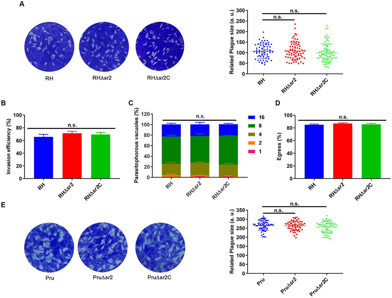 SR2 is dispensable for the growth of T. gondii in type I RH strain and type II Pru strain. (A) Representative plaques produced by RH, RH∆sr2 and RH∆sr2C strains. No significant differences were detected in the number and size of plaques formed by RH, RH∆sr2 and RH∆sr2C strains infecting HFFs for seven days. (B-D) SR2 was not essential for the invasion, intracellular replication, and egress of RH, RH∆sr2 and RH∆sr2C tachyzoites. (E) Representative plaques formed by Pru, Pru∆sr2 and Pru∆sr2C strains showing no significant differences in the number and size of plaques formed by Pru, Pru∆sr2 and Pru∆sr2C strains nine days post-infection. n.s., not significant.