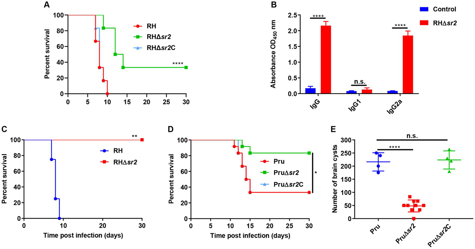 SR2 is important for T. gondii virulence. (A) Probability of survival of mice (6 mice/group) injected intraperitoneally (i.p.) with 100 tachyzoites of RH, RH∆sr2 and RH∆sr2C. (B) Detection of high IgG and IgG2a antibody levels showed that the survived mice infected by viable RH∆sr2 tachyzoites induced Th1 immune response. (C) Probability of survival of RH∆sr2-infected mice i.p. challenged, 45 days after infection, with 500 RH tachyzoites. (D) Survival of mice (6 mice/group) i.p. infected by 200 tachyzoites of Pru, Pru∆sr2 and Pru∆sr2C. (E) The burden of brain cysts detected in mice infected by 200 tachyzoites of Pru, Pru∆sr2 and Pru∆sr2C was determined at 30 days after infection. n.s., not significant. *, p < 0.05; **, p < 0.01; ***, p < 0.001; ****, p < 0.0001, compared with control.