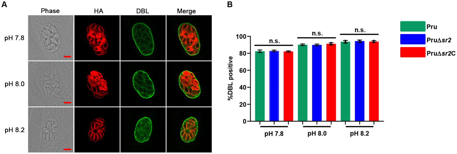 In view of the severe defects in cyst formation caused by disruption of SR2 in vivo, Pru, Pru∆sr2 and Pru∆sr2C strains were exposed to different alkaline conditions (pH 7.8, pH 8.0, and pH 8.2) to study whether SR2 affects tachyzoite to bradyzoite transformation in vitro. The tachyzoite to bradyzoite transformation efficiency was evaluated by counting cyst wall stained with FITC-DBL using fluorescence microscopy. Surprisingly, the results showed that tachyzoite to bradyzoite conversion efficiency of Pru∆sr2 in vitro was not significantly different under different alkaline conditions compared with Pru or Pru∆sr2C strains, indicating that SR2 does not contribute to the tachyzoite to bradyzoite conversion in vitro (Figures 6A,B).