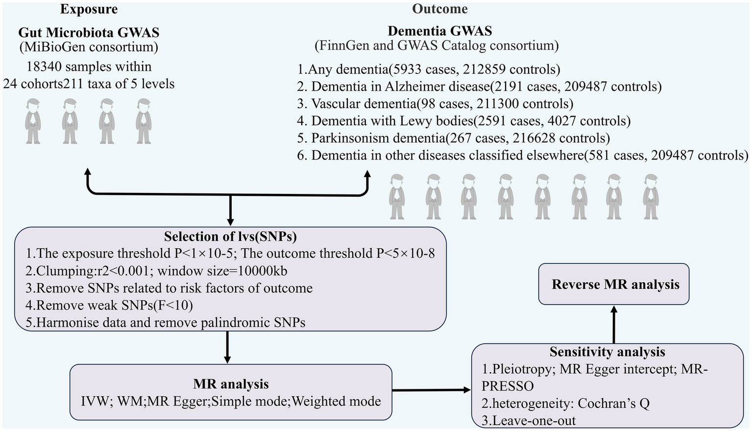 Assuming that there are relevant GMs that can have an effect on dementia and its subtypes in the final findings, we will further conduct a reverse MR analysis to explore the effect of dementia on GMs, with dementia as the exposure and GMs as the outcome to avoid reverse causality interfering with the results of this study.