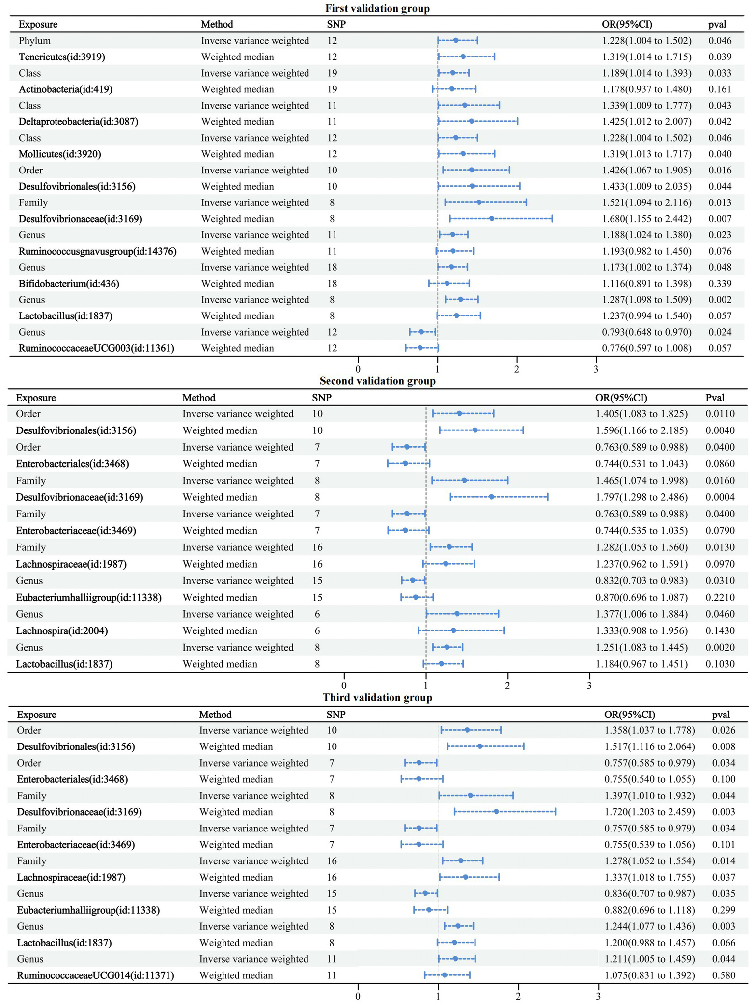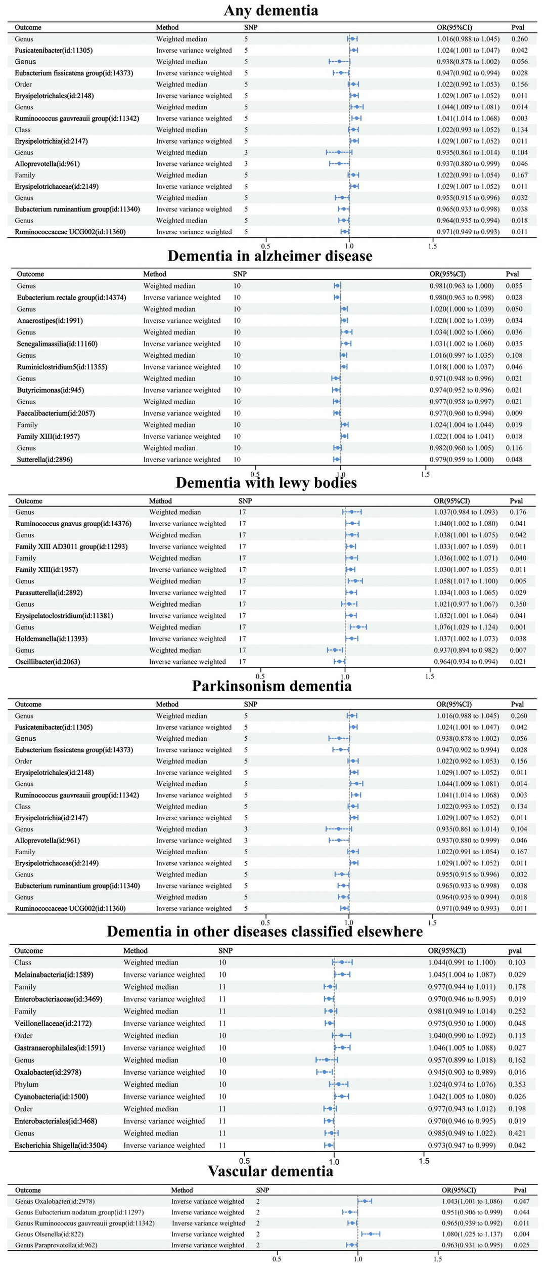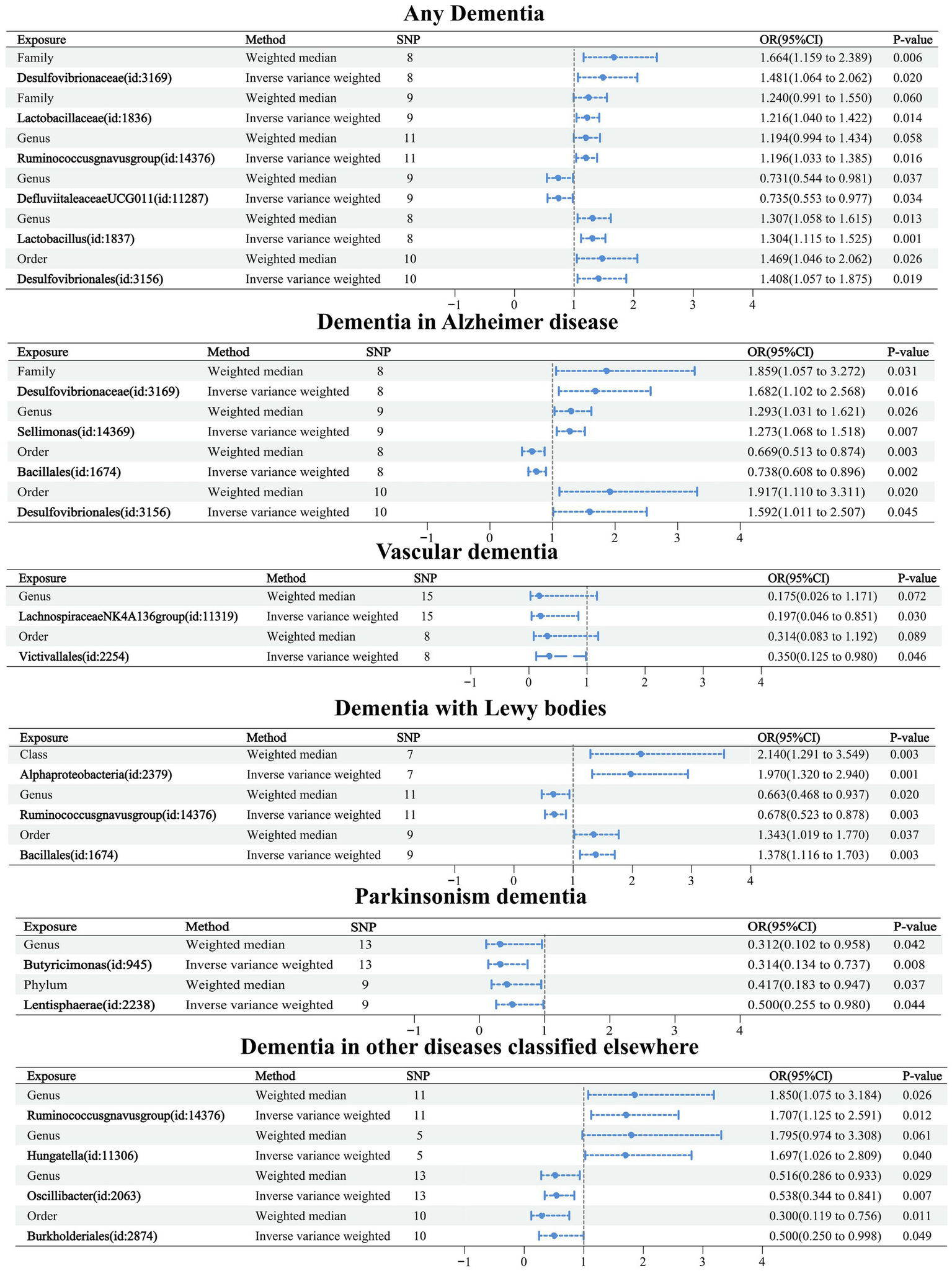Causal relationships were obtained for six related GMs in any dementia using the IVW method, and all six relationships were more stable under IVW and WM cross-validation. Among them, family Desulfovibrionaceae (OR: 1.481, 95% confidence interval (CI): 1.064–2.062, p = 0.020), family Lactobacillaceae (OR: 1.216. CI: 1.040–1.422, p = 0.014), genus Ruminococcusgnavus group (OR: 1.196, CI: 1.033–1.385, p = 0.016), genus Lactobacillus (OR: 1.304, CI: 1.115–1.525, p = 0.001), and order Desulfovibrionales (OR: 1.408, CI: 1.057–1.875, p = 0.019) were related to increased risk of dementia. Genus Defluviitaleaceae UCG011 (OR: 0.735, CI: 0.553–0.977, p = 0.034) was related to a reduced risk of dementia.