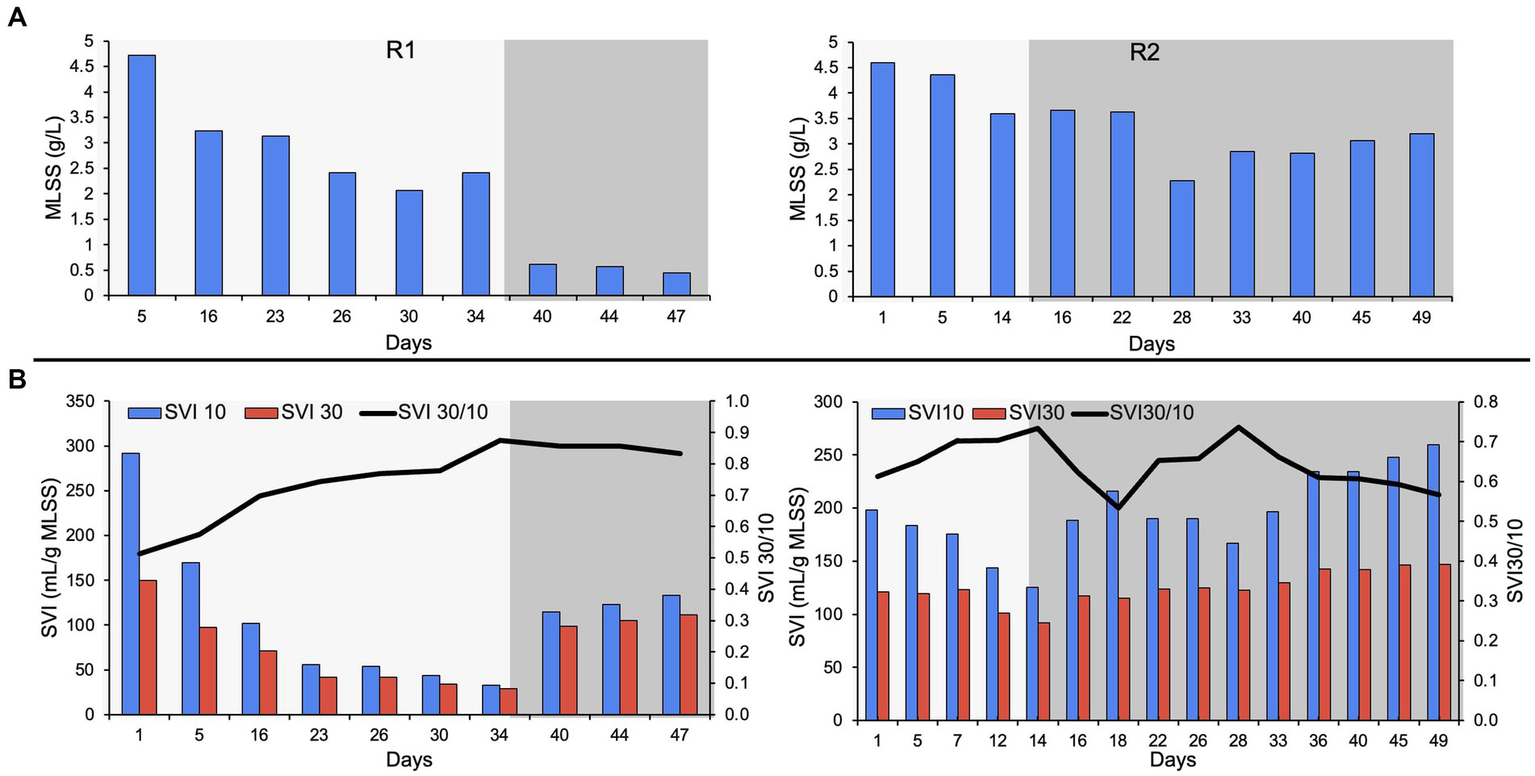 Figure 1. (A) MLSS in R1 and R2, (B) settleability of the biomass showing the SVI30, SVI10 and SVI30/ SVI10. The lighter shade indicates phase one and the darker shade indicates phase two.
