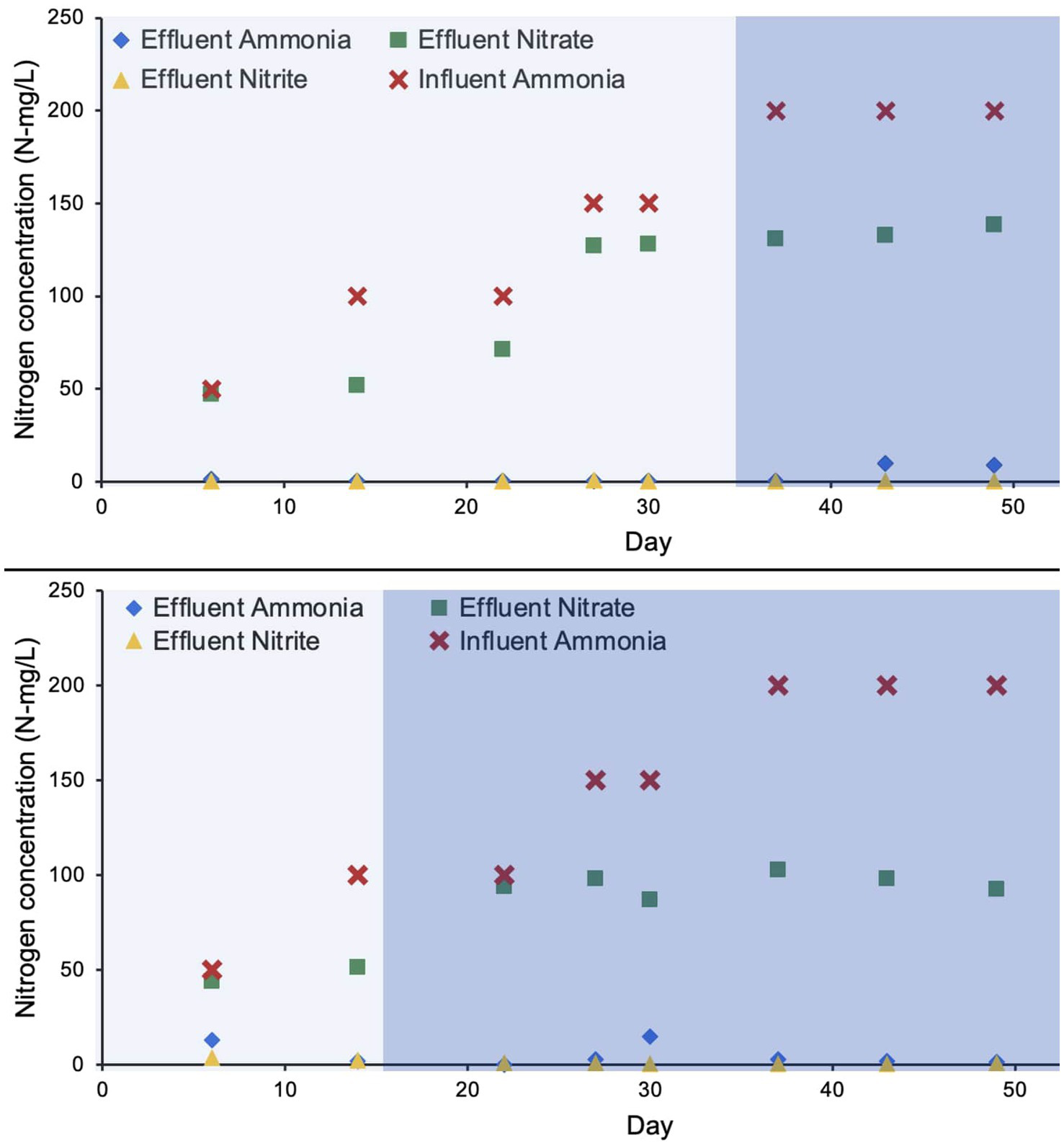 Ammonia removal efficiency for R1 and R2 over the duration of approximately 50 days was 98.5 and 96.6%, respectively. The nitrification efficiency was 100% during the autotrophic phase, however, a drop in ammonia removal was observed during the heterotrophic phase (Figure 2). R1 and R2 maintained their nearly complete ammonia removal efficiency as higher concentrations of influent ammonia increased to 200 N mg/L (Figure 2). Nitrite concentrations in both reactors were also limited to nearly zero, as the average in each bioreactor was 0.15 mg/L and 1.27 mg/L, respectively. The nitrate accumulation was relatively higher in R1 to a maximum concentration of 132 N mg/L on day 49 of bioreactor startup. In R2 (the bioreactor operated with a shorter autotrophic phase) the nitrate accumulation was relatively lower (98 N mg/L) on day 49 (Figure 2).
