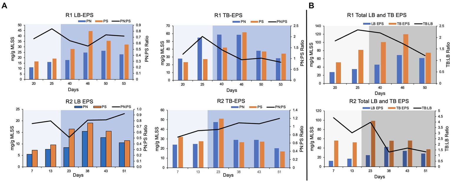 Figure 3. EPS composition. (A) Protein (PN) and polysaccharide (PS) content and PN:PS in the loosely (LB) and tightly bound (TB) extracted EPS. (B) TB and LB EPS and TB:LB ratio in the extracted EPS. The lighter shade indicates phase one and the darker shade indicates phase two.