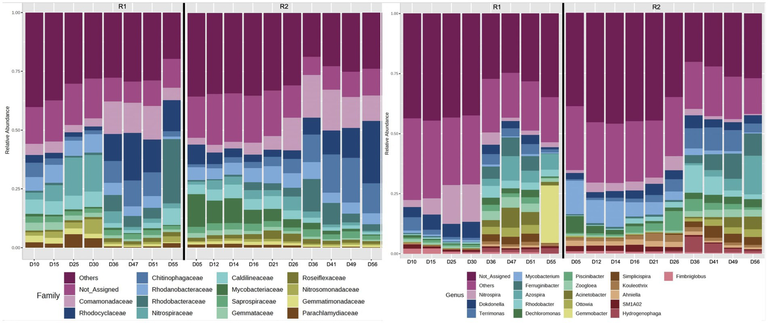 Figure 4. 16S rRNA gene sequencing (Illumina MiSeq) showing the relative abundance of the most abundant families, and the relative abundance of the 20 most abundant genera. Phase one was up to day 35 in R1 and day 15 in R2.