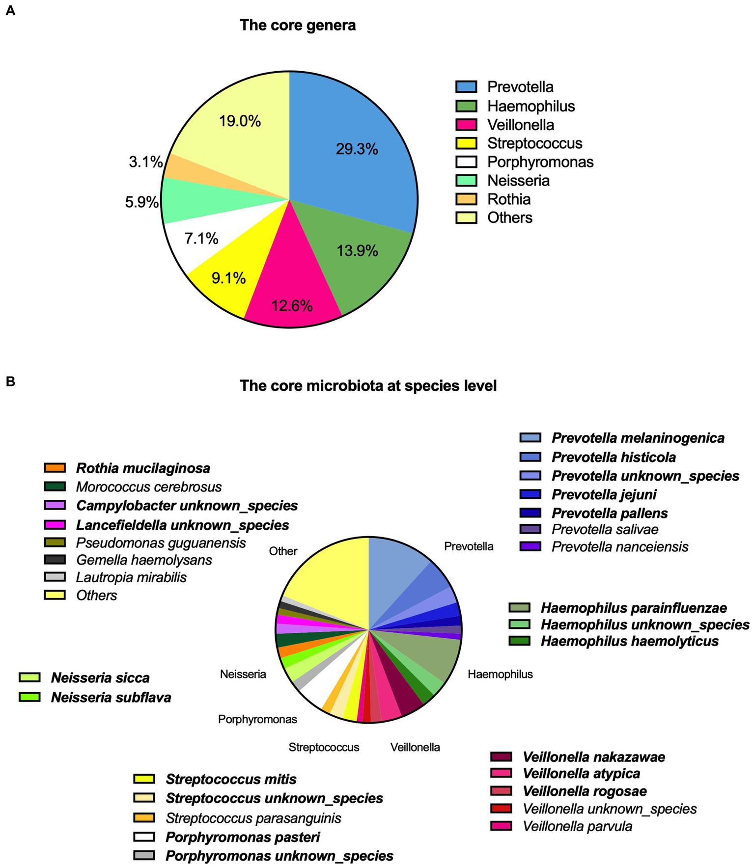 Figure 1. Description of saliva microbiota with (A) the core genera and (B) at a species level. The top 20 prevalent species are highlighted with bold.