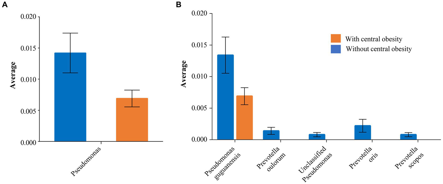 Figure 2. The taxa significantly differing between the groups with (orange) and without (blue) central obesity are shown with mean abundance for (A) genus and (B) species levels. The error bars represent SEM.