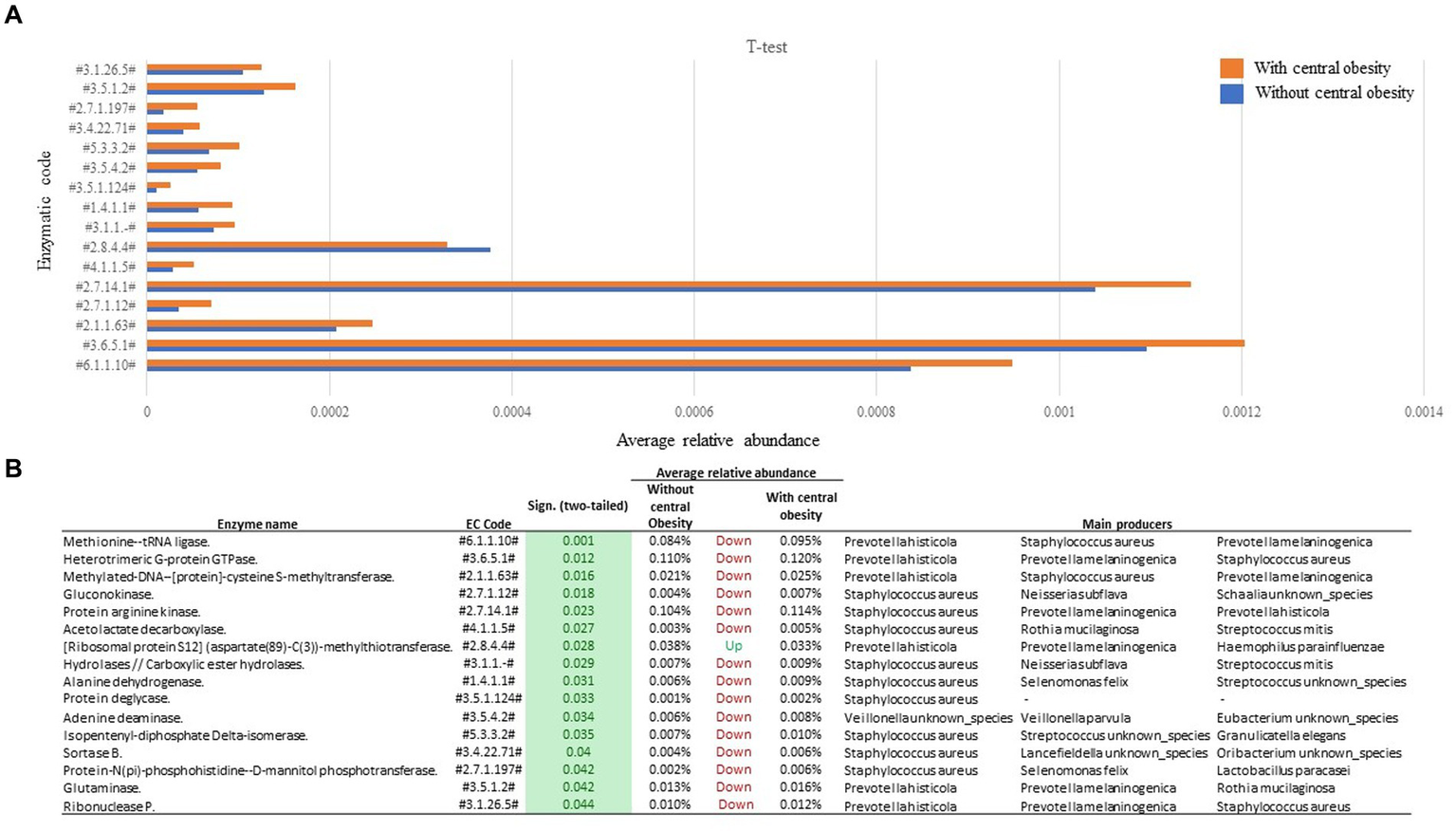 Figure 3. Functional analysis of saliva samples from participants with (orange, n = 14) and without central obesity (blue, n = 36) (A) revealed several differences in microbiota-encoded enzymatic potential profiles. (B) Table represents main producers of each enzymatic class.