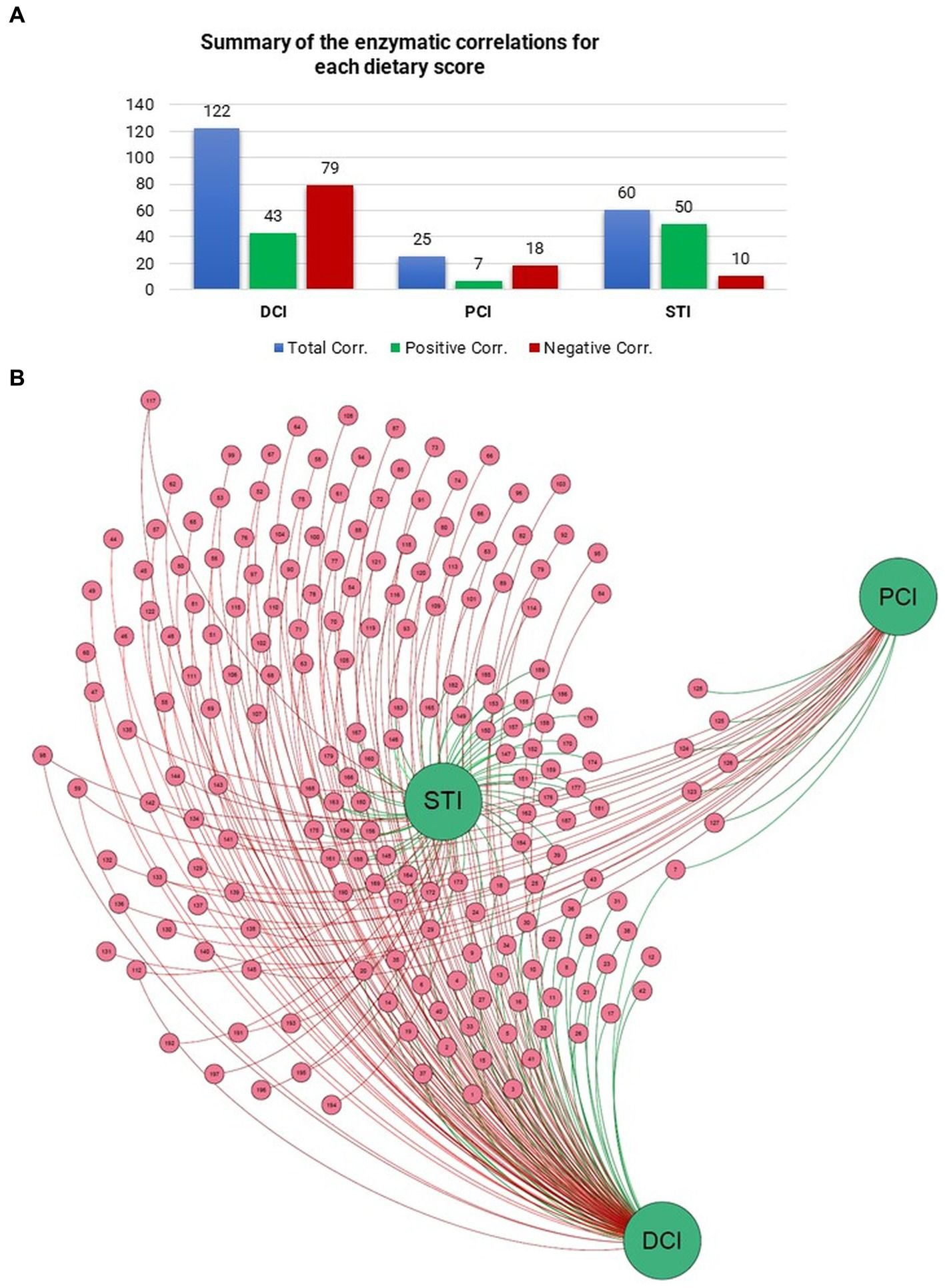 Figure 4. Number of Pearson correlations between (A) dietary scores and enzymes are presented in the table. (B) Force-driven network represents the entity of the correlation scores between dietary scores and enzymes through Gephi (Version 0.9.6) software and ForceAtlas2 algorithm.