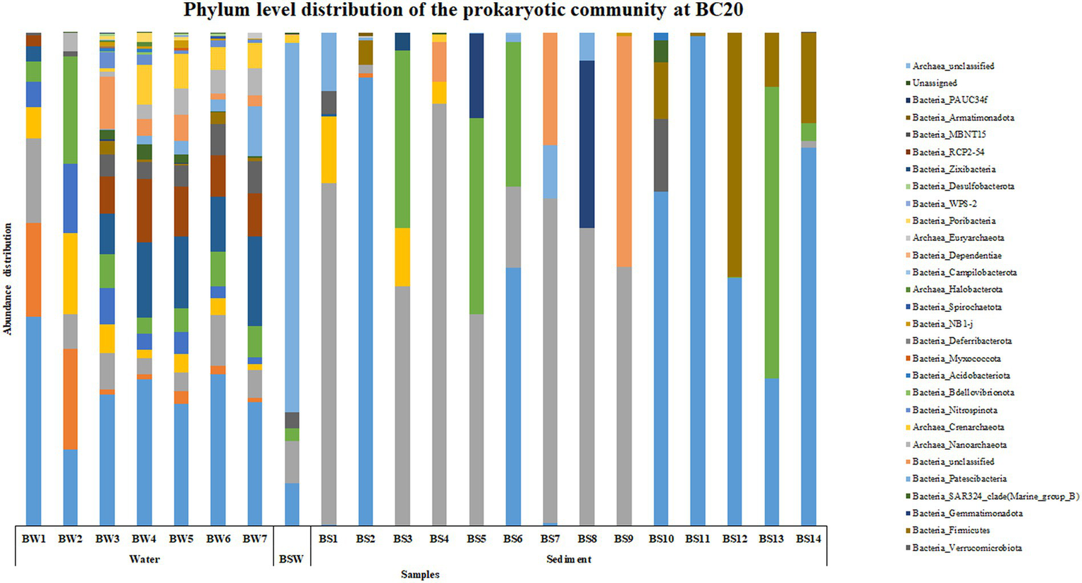 Microbiome and Phyloseq packages in RStudio (RStudio Team, 2020) with R 4.1.0 package were used to obtain the alpha diversity indices such as Shannon, Simpson’s richness, observed species, and Pielou’s evenness (RStudio Team, 2020). Correlation plots were constructed in PAST 4.07b (Hammer et al., 2001) to assess the correlation between microbial groups and the physicochemical parameters. A vertical comparison of the data obtained from the samples of the water column and the sediments was performed to evaluate the vertical prokaryotic distribution. Also, data obtained from the samples were compared to assess the differences between prokaryotic diversity across these three locations. Similarity percentage analysis (SIMPER—R vegan function) was performed to assess the contribution of the taxonomic group contributing maximum towards the differences in the abundances between the samples or sample groups. For this, we divided the samples into three groups, namely, water, sediment, and overlaying water samples for ease of understanding and comparison. For water samples, a comparison of all the water depths was made against the topmost one (30 m) to understand how the taxa change with depth. Similarly, for sediment samples, all the sediment samples were compared against the topmost sediment sub-section (0–0.5 cm) to assess the change in the abundance of the taxa with depth. Also, two additional comparisons were made: water samples of BC20 station to IRZ and PRZ, respectively, to assess the dissimilarity in the water column depth across the three locations. Similarly, all the water, sediment, and overlaying water samples of BC20 were compared against the IRZ and PRZ, respectively, to assess the overall dissimilarity across the three locations.