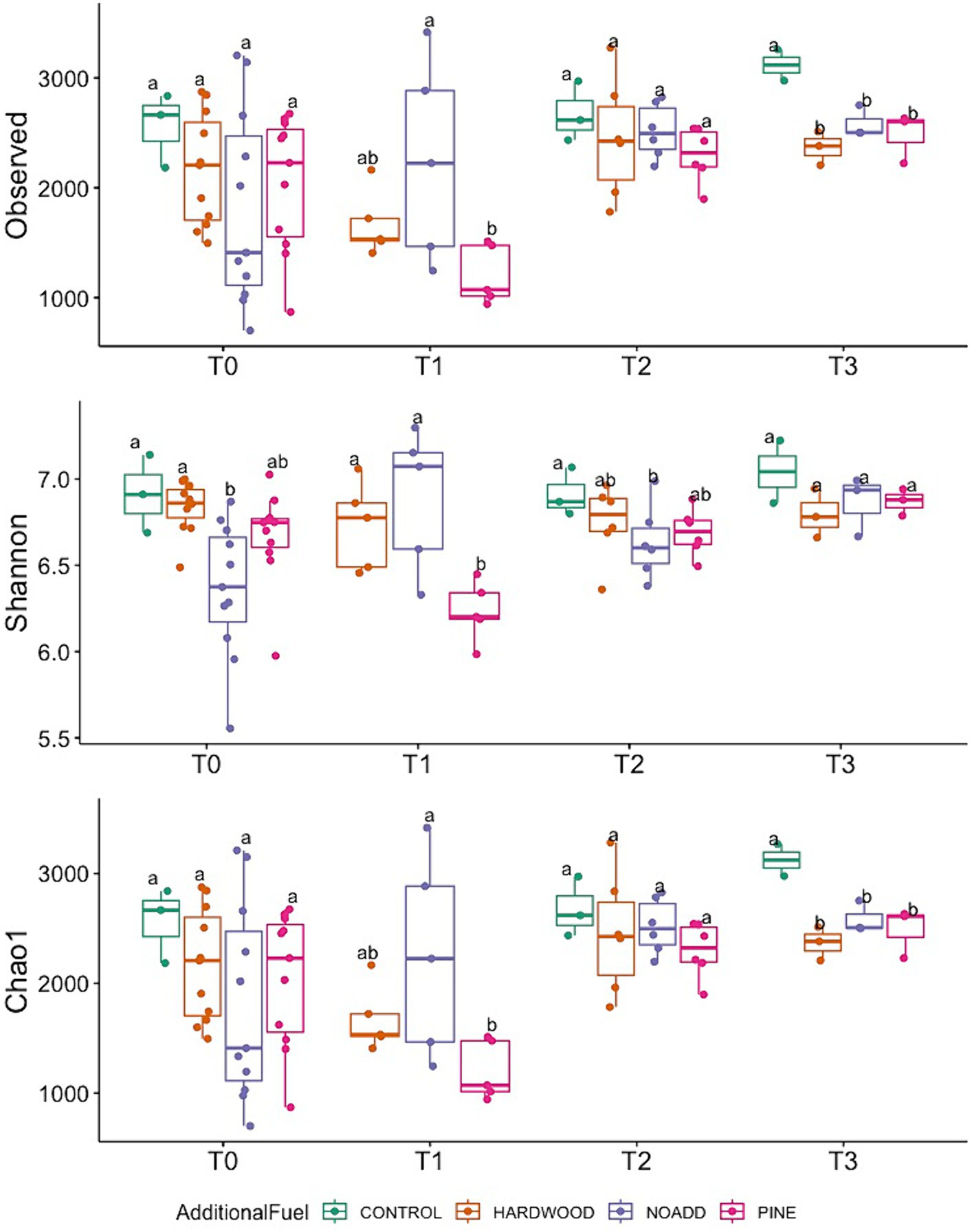 Temporal variation in Observed Richness, Shannon diversity index, and Chao1 richness estimator across different fuel treatments (T0, T1, T2, T3). Different letters mean significant differences, and the same letters mean no significant difference in abundance (based on ANOVA followed by Duncan’s multiple range test, p < 0.05).
