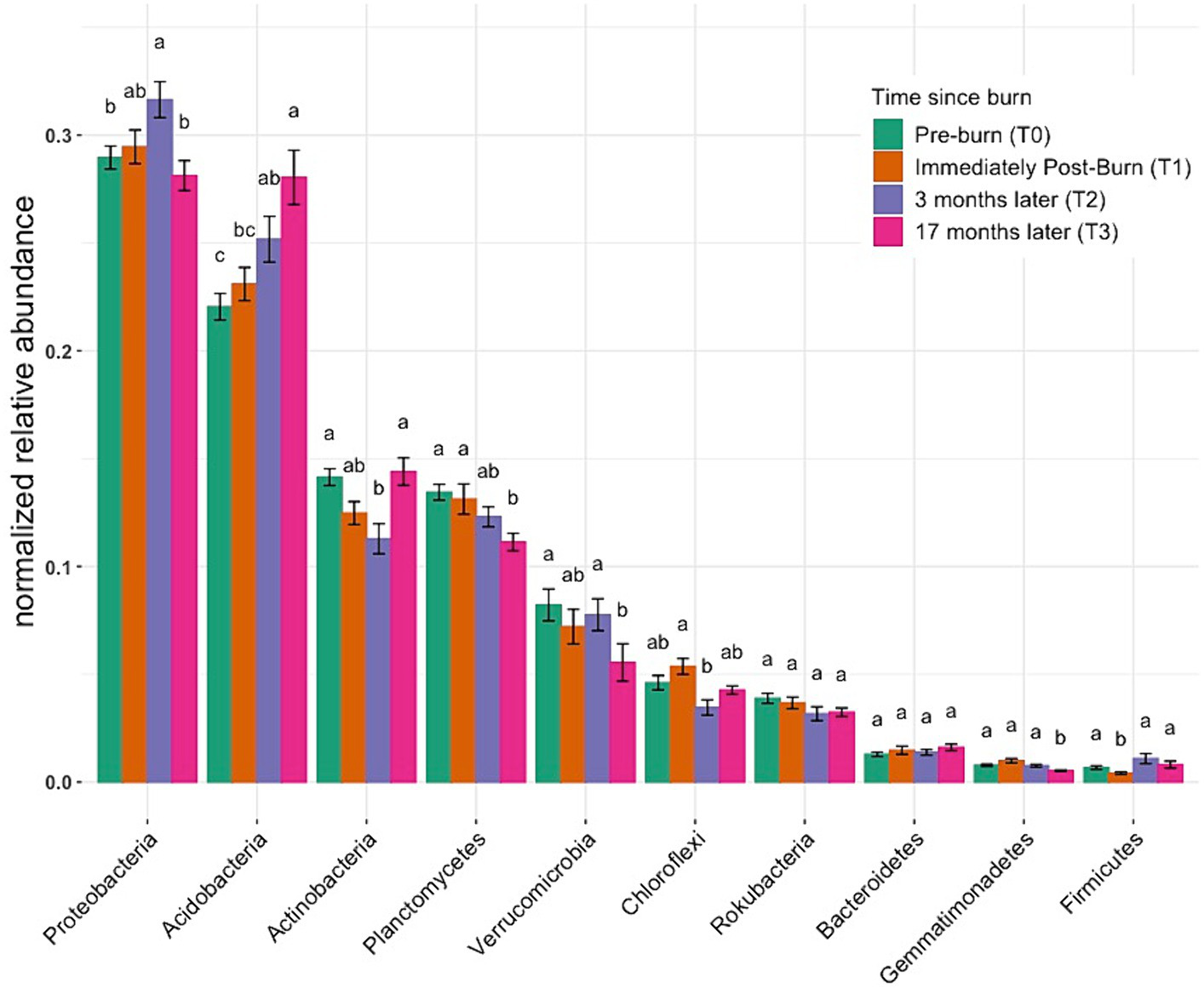 Figure 4 illustrates the normalized relative abundance of bacterial phyla across the community using ANOVA to identify to any statistical significance over time. Considering the taxonomic abundance across different time points, the three most predominant phyla were Proteobacteria, Acidobacteria, and Actinobacteria, with mean relative abundances of 29, 25, and 13%, respectively. Differential testing showed distinct community differences across groups (alternate relative abundance plots utilizing a different method can be found in Supplementary Figures S6A–D). Small but significant increases were observed between post-fire time points for Proteobacteria (T0–28.96%, T2–31.64%) and Acidobacteria (T0–22.04%, T3–28.04%; p < 0.05, ANOVA). The relative abundance of the bacterial phylum Verrucomicrobia decreased from 8.21% at T0 to 5.55% % at T3 (p < 0.05, ANOVA). Taxonomic bar plot without application of differential tests can be found in Supplementary Figure S5.