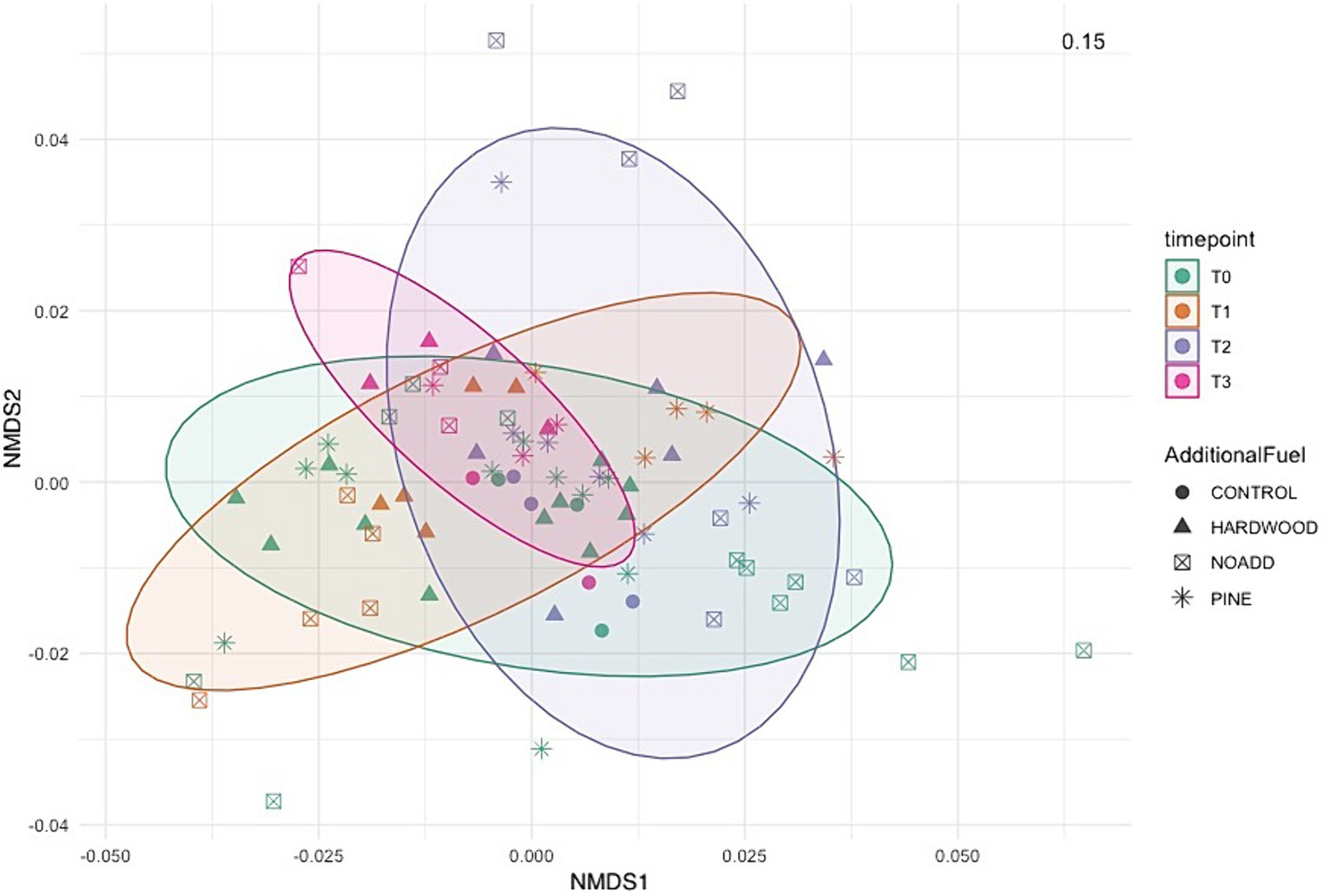 Our MiSeq runs yielded a total of 16.9 M sequences, with a mean of 201,376 sequences/sample and a total of 33,234 ASVs after trimming, filtering, and denoising. The Shannon-Wiener curve of all samples leveled out at a sequencing depth of 5,022 sequences/sample (Supplementary Figures S2, S3), suggesting that the richness of the samples has been fully observed. Figure 3 shows the alpha diversity variation in the microbial community across different time points (T0—Pre-Burn, T1—Immediately After Burn, T2–3 Months After Burn, T3–17 Months after Burn). The study revealed a significant increase in species richness from the initial (T0) to the final time point (T3). The Observed richness (ASVs) exhibited a significant rise, with counts increasing from 2051 at T0 to 2,595 at T3 (p = 0.003). The Chao1 richness estimator mirrored this trend, with the estimate increasing from 2053 at T0 to 2,598 at T3. The Shannon index showed variations between time points but did not reach statistical significance (p = 0.16). PERMANOVA was applied to the differential test of weighted Unifrac distances among groups and showed that there was a significant difference across time points (R2 = 0.118, F = 3.64, p = 0.001) but less significantly so for the types of additional slash fuel (R2 = 0.061, F = 3.64, p = 0.018). Violin plots comparing the alpha diversity index can be found in Supplementary Figure S4.