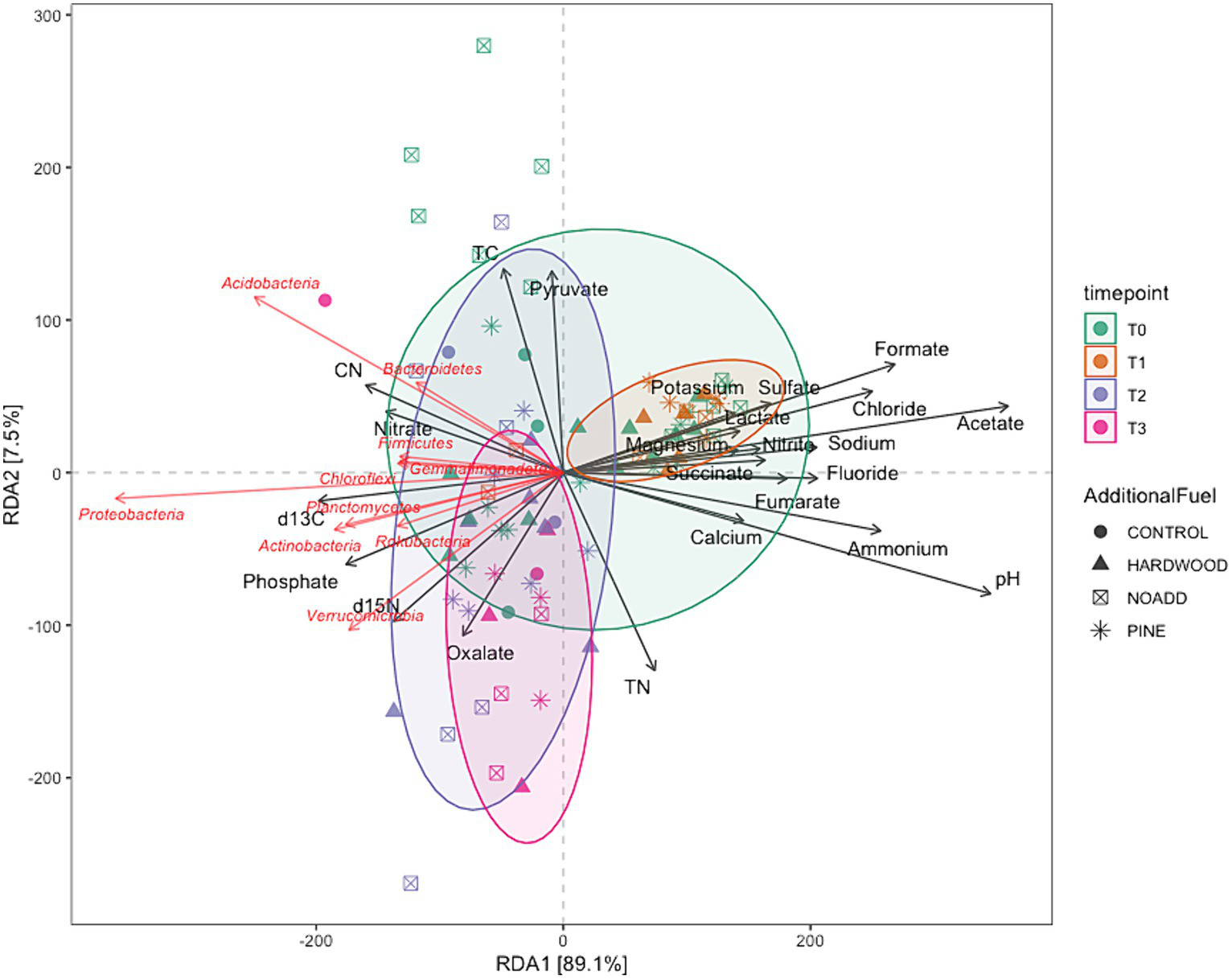 Our PERMANOVA analysis revealed significant differences in microbial community structure across the four-time points. The variation observed in community structure emphasizes the dynamic nature of soil microbial communities following prescribed burns. However, it is noteworthy that the additional slash fuel had a limited impact on microbial communities, suggesting that other factors, such as fire severity or soil properties, might exert stronger influences on post-burn microbial community structure. Furthermore, the clustering of microbial communities in NMDS ordination and RDA analysis (Figures 5, 6) at different time points indicates that the overall pre- and post-fire microbial communities remained relatively consistent (for PCoA ordination plot, please see Supplementary Figure S4). This resilience of soil microbial communities may be attributed to factors such as resilient microbial taxa or the rapid post-fire recolonization of microbes (Whitman et al., 2016, 2019). Specific taxa did respond to fire-induced changes in soil properties, but the overall structure and function of the microbial community remain relatively consistent. Such stability could be attributed to microbial populations’ resilience and ability to adapt to changing conditions. It is important to note here that the longer vector arrows for pH and Acetate indicate that these two explanatory variables are strong drivers of microbial community composition in temperate mixed forest soils, with pH being the highest determinant factor explaining the most variations in the community composition. The relative abundance of some of the phyla, like Bacteroidetes, Acidobacteria, and Firmicutes, were correlated with increasing NO3− concentrations. Weber et al. (2014) mention that variations in the abundance of Bacteroidetes can be partially explained and correlated to carbon mineralization rates. An increase in abundance was observed for Bacteroidetes with each subsequent time point, albeit these changes were minor. Looking at the RDA triplot, we notice that it is correlated to the carbon-nitrogen (CN) ratio. This observation agrees with the carbon cycling characteristics expected of an early-stage post-fire soil ecosystem, as noted by Fierer et al. (2007) and Smith et al. (2008) since microbial anabolism is facilitated by the release of labile carbon into the soil after a burn event.