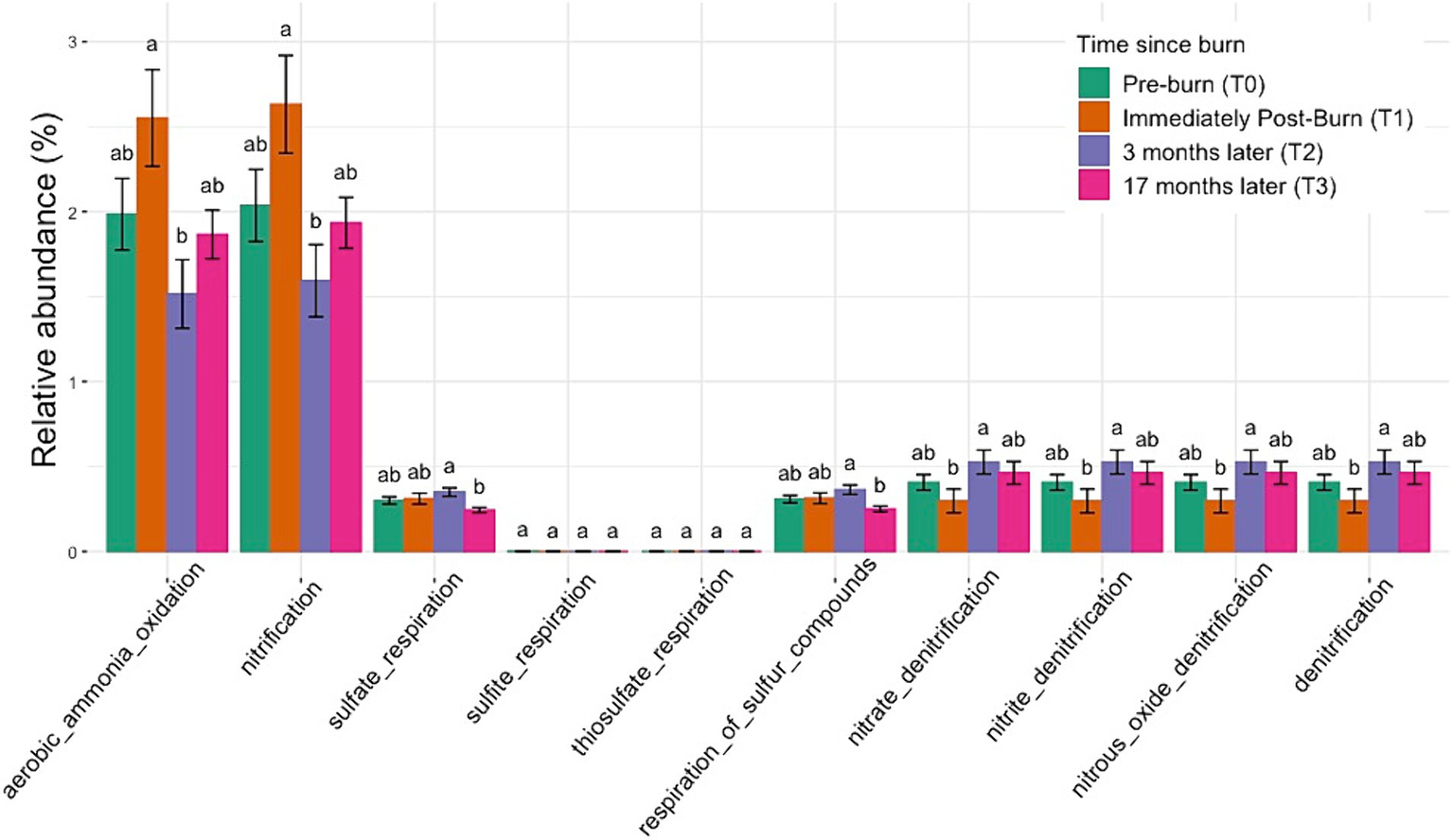 Normalized relative abundance bar plot using FAPROTAX shows the enrichment and depletion of specific functional traits across all taxonomic groups over time. Significant changes were observed across time points for nitrogen cycling and sulfate respiration in post-burn soils (based on ANOVA followed by Duncan’s multiple range test, p < 0.05). Different letters mean significant differences, and the same letters mean no significant difference.