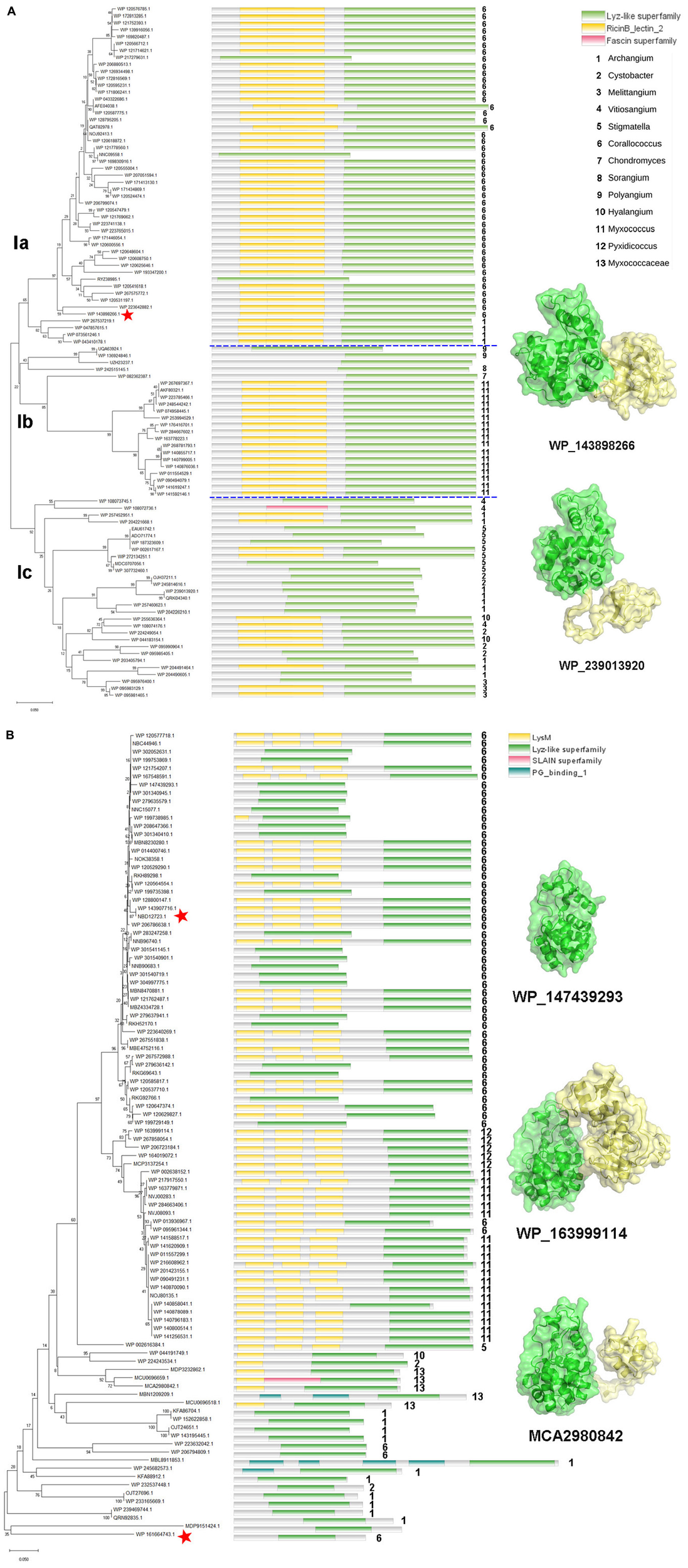 The enzymes of clade I are derived from the orders Myxococcales and Polyangiales. Phylogenetic analysis of GH19 modules revealed that these members clustered into three groups (Figure 3A). Group Ia includes enzymes derived from the genera Corallococcus and Archangium. All members of this group have a CBM13 module, except for three proteins with incomplete sequences. In addition to the genus Myxococcus, group Ib also includes enzymes derived from the genera Polyangium, Sorangium, and Chondromyces, belonging to the order Polyangiale, whose additional modules could not be annotated. The enzymes in the group Ic are derived from six genera of myxobacteria in the Myxococcaceae family, namely Vitiosangium, Archangium, Stigmatella, Cystobacter, Hyalangium, and Melittangium, and more than half of them have an appended module of unknown function.