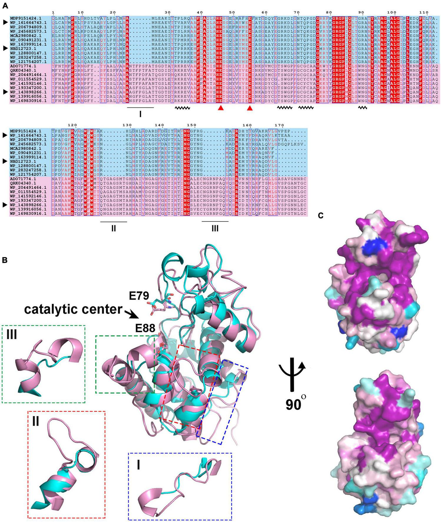 Sequence and structure alignment of C25GH19s. (A) Multiple sequence alignment of C25GH19s and their homologs. The pink and blue background indicate the proteins in Clade I and Clade II. The catalytic residues are indicated by red triangles. The black triangle indicates C25GH19A (WP_143898266), C25GH19B (WP_161664743), and C25GH19C (NBD12723). The black underlines indicate loops of significantly different lengths. The black wavy lines indicate conserved sites that differ significantly between the two clades. (B) Superposition of the model structures of C25GH19A (magenta) and C25GH19B (cyan). The catalytic residues are shown in sticks and labeled according to C25GH19B. The three loops of remarkably different lengths are circled and shown in the enlarged diagrams. (C) Conservation of residues across the Clade I (up) and Clade II (down) calculated by AL2CO and mapped onto C25GH19A and C25GH19B, respectively. Colors range from variable (blue) to conserved (purple).