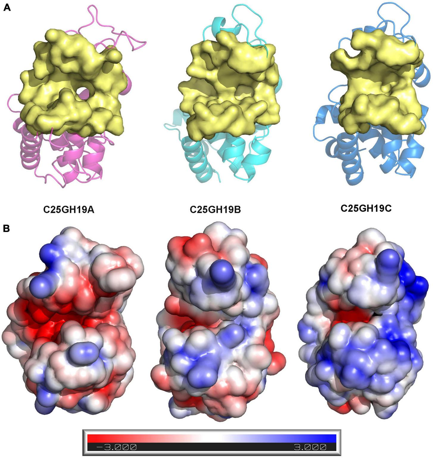 Structural comparison between C25GH19s. (A) The substrate binding pockets (yellow) of C25GH19A (magenta), C25GH19B (cyan), and C25GH19C (blue) predicted by CavityPlus. (B) The electrostatic potentials of protein surfaces. The electrostatic potential ranges from –3 to +3. Red indicates negatively charged, blue indicates positively charged, and white indicates uncharged.