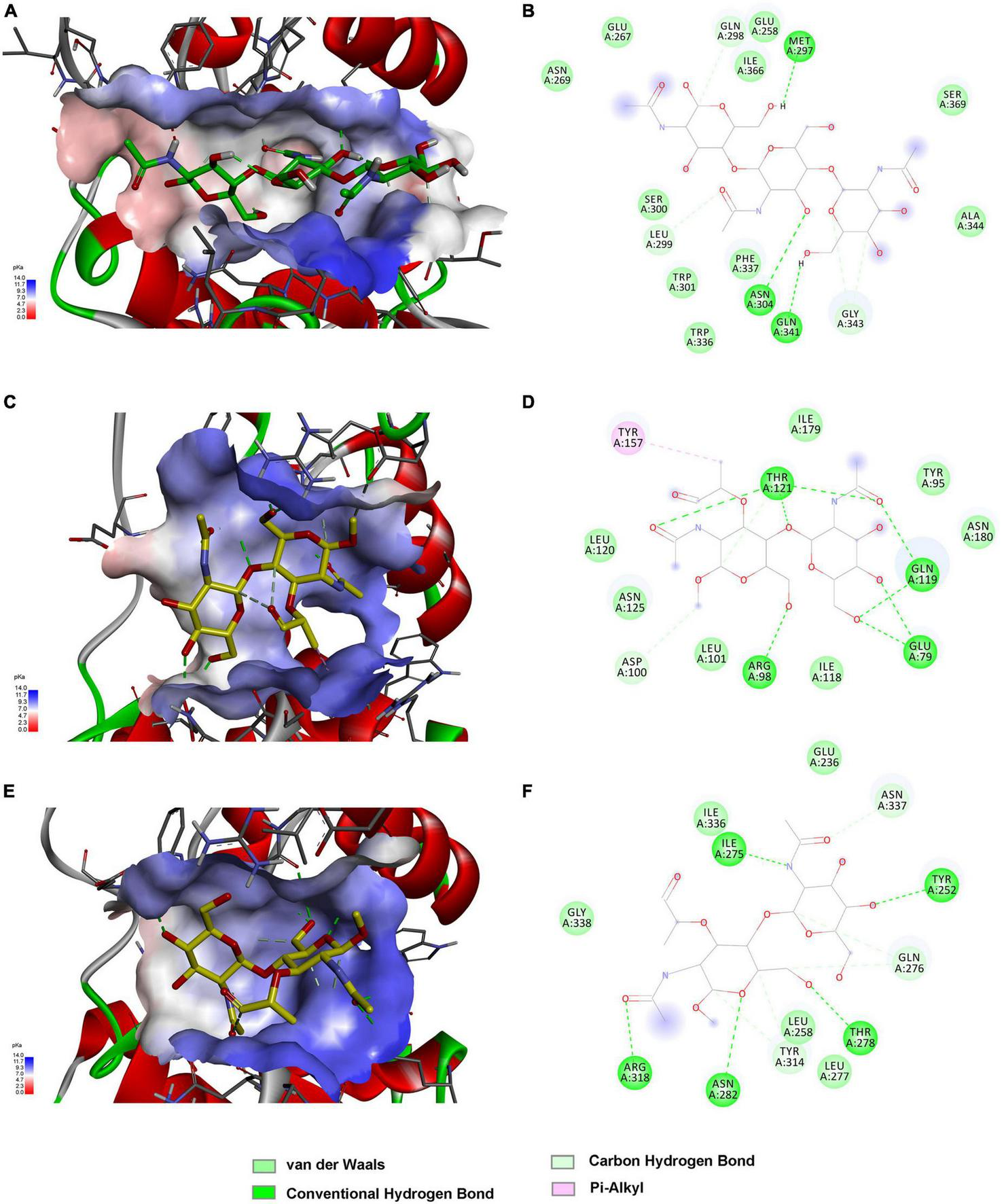 The above findings inspired us to further explore the binding modes of these enzymes to different polysaccharide substrates. To analyze the possible interaction of C25GH19A with chitin substrates, the chitin trisaccharide (GlcNAc)3 was extracted from the oligosaccharide-complexed crystal structure of the chitinase OfChtI and docked into the model structure of C25GH19A (Figures 6A, B). The chitin trisaccharide binds well in the substrate binding pocket of C25GH19A with a binding free energy of −2.32 kcal/mol. The residues M297, N304, Q341, Q298, L299, and G343 form hydrogen bonds with (GlcNAc)3, while residues N269, E267, E258, I366, S369, A344, S300, W301, W336, and F337 interact with the chitin trisaccharide through van der Waals. Disaccharide NAGNAM was extracted from the complex crystal structure of the protein PGRP-Iβ and docked into the model structures of C25GH19B and C25GH19C, respectively, to analyze their potential binding modes to peptidoglycan substrates (Figures 6C–F). The binding free energies of C25GH19B or C25GH19C complexes with NAGNAM obtained by molecular docking were −5.64 and −5.81 kcal/mol, respectively. In C25GH19B, residues T121, Q119, E79, R98, and D100 form hydrogen bonds with the substrate NAGNAM; residues I179, Y95, N180, I118, L101, N125, and L120 participate in van der Waals interactions; in addition, Y157 forms Pi-alky interaction with NAGNAM (Figure 6D). C25GH19C also interacts with NAGNAM via hydrogen bonds and van der Waals interactions, and the residues involved include I275, Y252, T278, N282, R318, N337, Q276, Y314, E236, L277, L258, G338, and I336 (Figure 6F). Since both chitin and peptidoglycan are natural polymers, the use of disaccharides and trisaccharides as model substrates here only indicates the possible binding modes between them, and further studies on the activities and intermolecular interactions of these enzymes on these natural substrates are still needed in future work.