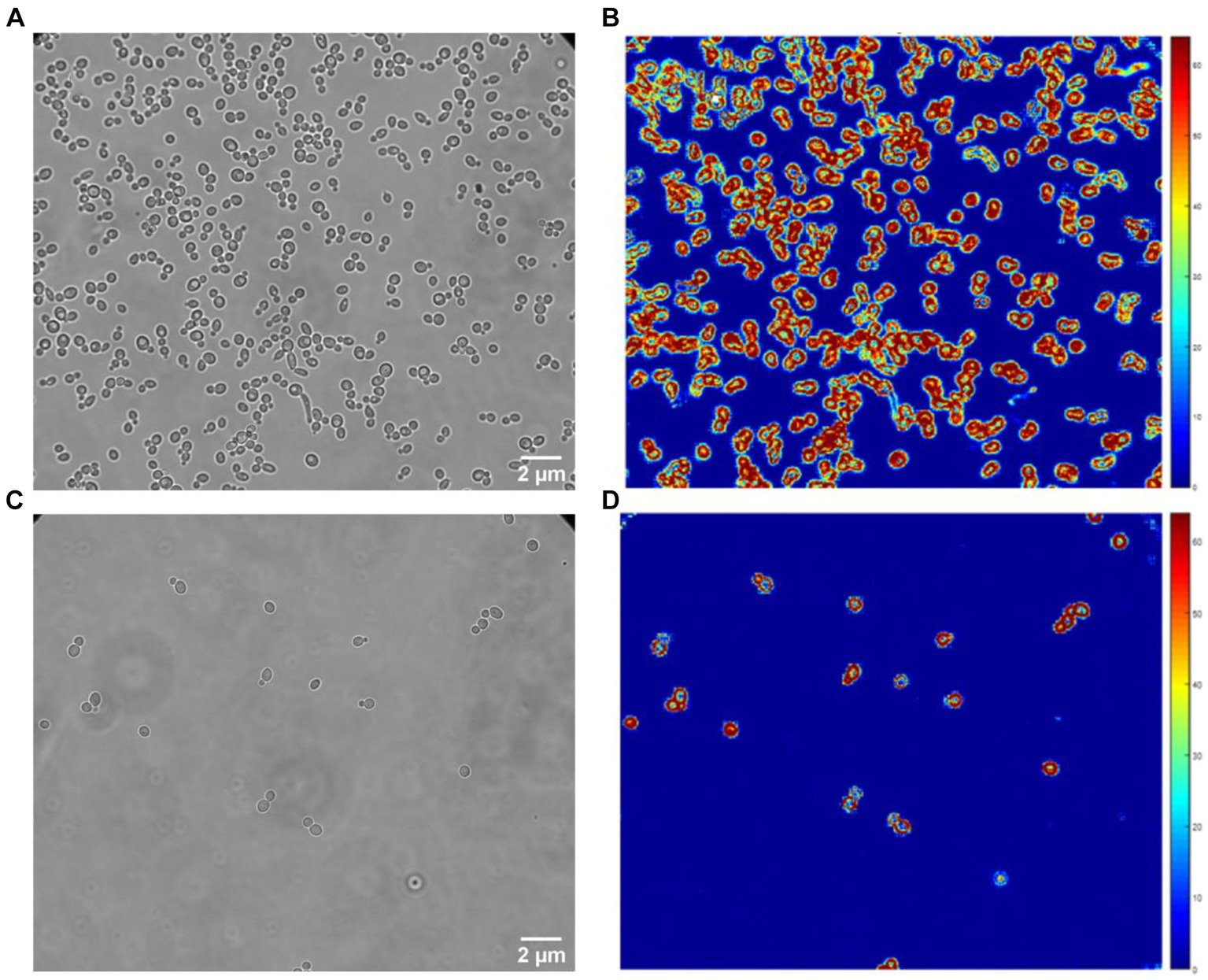 Classical optical (A,C) and Diff images (B,D) of C. albicans. Control (A,B) and fluconazole (C,D) exposed samples.