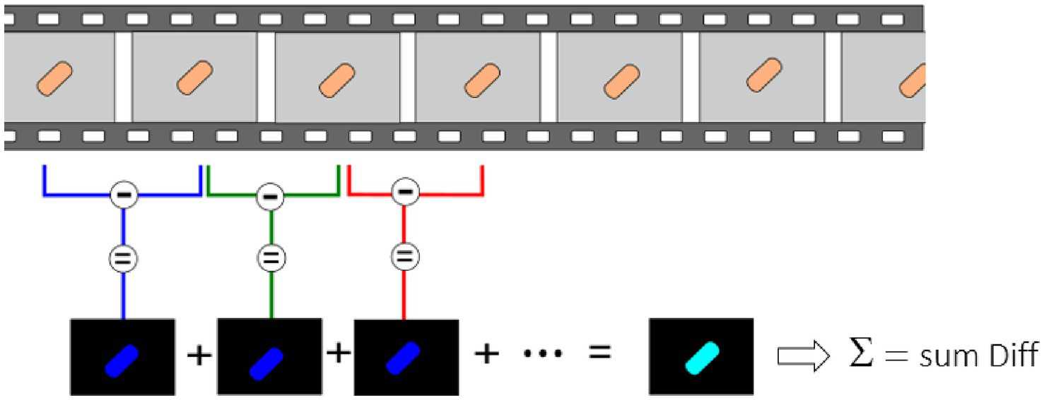 Ten s-long videos are recorded and processed to highlight minute pixel changes occurring between consecutive frames. Consecutive frames are subtracted from each other, and the sum of all these differences is made.