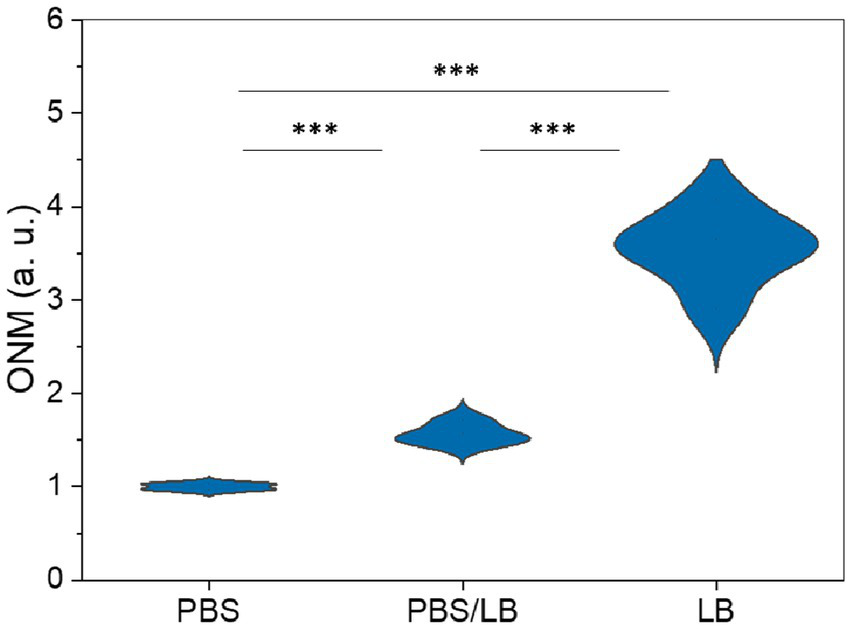 The classical ONMD algorithm required the user to select individual cells to be tracked using a cross-correlation algorithm (Willaert et al., 2020). This methodology limits the number of cells that can be analyzed in a reasonable timeframe. In the new approach, the sum of the pixels composing the entire diff image is used to quantify nanomotion. Therefore, more microorganisms are considered, no cell recognition is needed, and the contribution of the user is limited to selecting videos to be processed. First, we tested the efficiency of the new technique to monitor the nanomotion of E. coli as a function of the nutrient concentration in the medium. The cells were exposed to 100% PBS, 50% PBS and 50% LB, and 100% LB. Figure 4 depicts the global nanomotion (sum Diff) of 4 (PBS and PBS/LB) and 6 (LB) videos and is displayed as violin plots. As observed, the nutrient concentration in the medium increases the sum Diff value, indicating that rapid ONMD (rONMD) also reflects E. coli metabolism since the largest nanomotion signal is recorded for the condition with sufficient nutrients (100% LB medium). These obtained results were comparable to those obtained using AFM-based nanomotion detection (Longo et al., 2013) and the “traditional” ONMD measurements (Willaert et al., 2020). In both these cases, a decrease in nanomotion was observed in bacteria exposed to nutrient deficiency conditions.