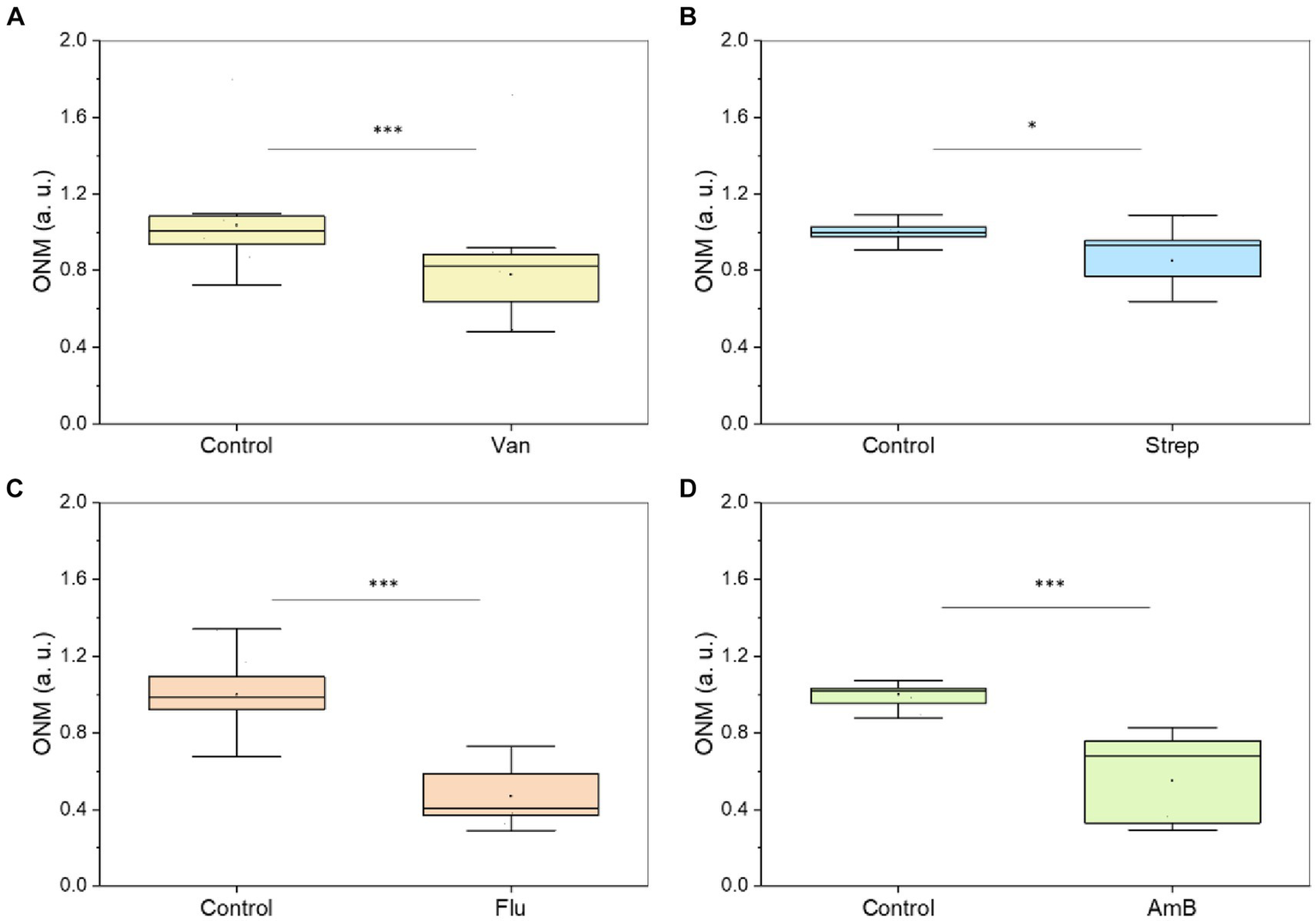 Different microorganisms exposed to an antibiotic or antifungal. (A)S. aureus – 50 μg/mL of vancomycin (2 h at 37 ᴼC) (five replicates), (B)M. smegmatis – 50 μg/mL of streptomycin (5 h at 37 ᴼC) (five replicates), (C)C. albicans 5,314–100 μg/mL of fluconazole (5 h) (five replicates), (D)S. cerevisiae – 200 μg/mL of amphotericin B (5 h) (five replicates). *p < 0.05, *** p < 0.001; Van: vancomycin, Strep: streptomycin, FLU: fluconazole, AmB: amphotericin B.