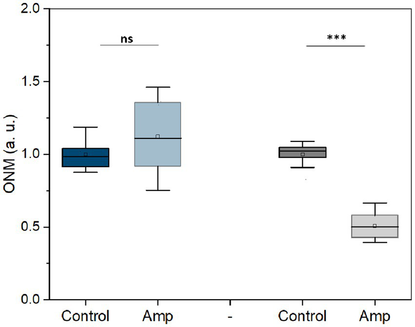 Nanomotion of E. coli resistant (blue) and sensitive (gray) to ampicillin after 3 h treatment (50 μg/mL at 37 ᴼC). ***p < 0.001, ns: no significant; Amp: ampicillin; three replicates.