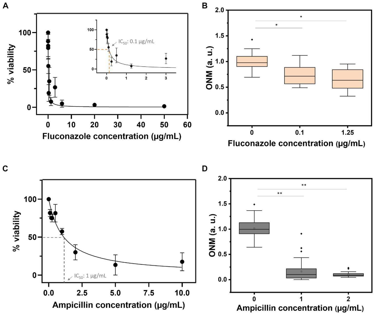 Viability curves based on the OD600 assay (A,C) and the rONMD boxplots (B,D) for C. albicans (upper panels) and E. coli (bottom panels) exposed to fluconazole and ampicillin, respectively. At least three independent experiments are represented by each data point. *p < 0.05, **p < 0.01.