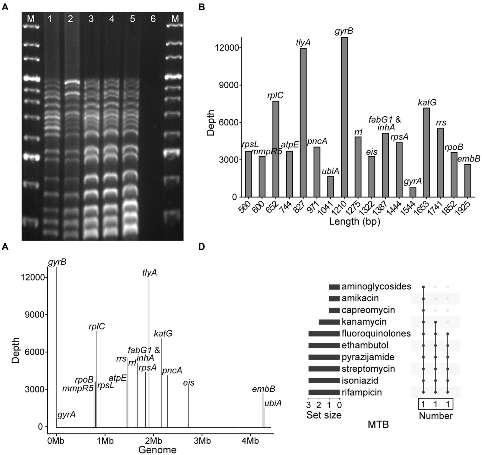 Development of nanopore targeted sequencing with multiplex PCR for drug resistance assay of Mycobacterium tuberculosis (MTB). (A) Electrophoresis of multiplex PCR-based amplicons from five MTB samples and a negative control. The bands of electrophoretic lanes 1–5 from bottom to top were rpsL (560 bp), mmpR5 (600 bp), rplC (652 bp), atpE (744 bp), tlyA (827 bp), pncA (971 bp), ubiA (1,041 bp), gyrB (1,210 bp), rrl (1,275 bp), eis (1,322 bp), fabG1 and inhA (1,387 bp), rpsA (1,444 bp), gyrA (1,544 bp), katG (1,653 bp), rrs (1741 bp), rpoB (1845 bp), and embB (1925 bp), respectively. The ladder sizes of DNA markers (M) were from 600 bp to 4,000 bp. The negative control was nuclease-free water. (B) Bar chart of 18 drug resistance-associated genes arranged according to the sizes of gene fragments against the sequencing depth of each gene after nanopore sequencing. (C) Distribution of 18 drug resistance-associated genes in MTB genome with their corresponding sequencing depths. (D) NTS-based drug resistance data are available for isolates after using the TBProfiler. Each row is a drug, and the columns with filled cells represent the set of isolates possessing drug resistance information. The box below shows the number of isolates in the set. The bar plot in the left panel shows the number of isolates with resistance information for each drug.