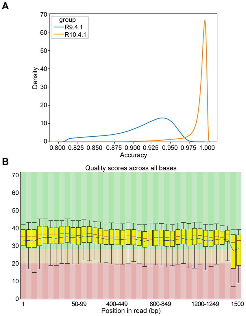 Accuracy of multiple amplicons sequenced by nanopore targeted sequencing (NTS). (A) The density distribution comparison of raw sequence accuracy of multiple amplicons between ONT flow cell R9.4.1 and R10.4.1. (B) Per base sequence quality of the single-base Q-value corresponding to the base position in the multiple amplicons from ONT flow cell R10.4.1. The column area of the box-whisker plot represents the range of 25–75% of Q-value, and the area between the upper and lower black lines represents the range of 10–90%. The blue line represents the average Q-value in the position, and the red line represents the median of the Q-value in the position. The background color divides the picture into three parts: good base quality (green), medium base quality (yellow), and poor base quality (red).