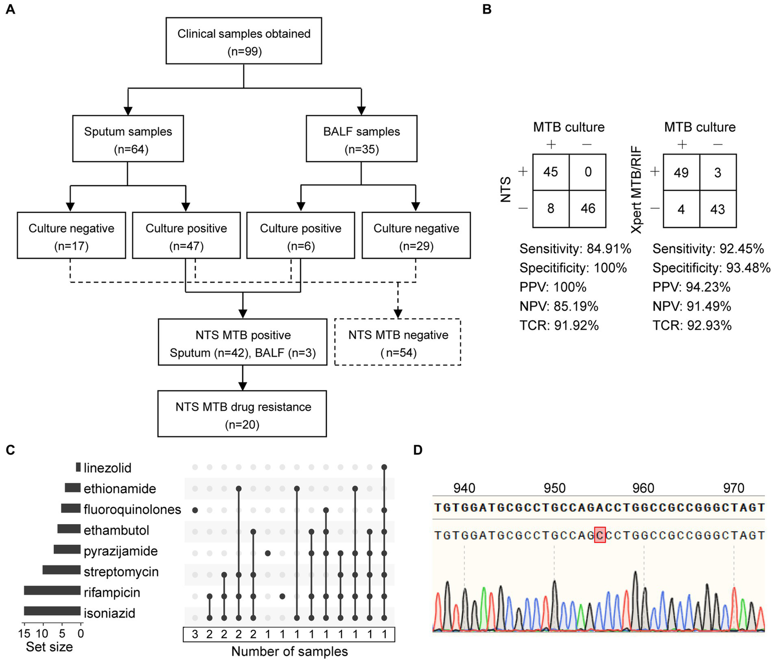 Statistics of clinical samples and their processes of inclusion in nanopore targeted sequencing (NTS) assay. (A) Analysis workflow of the 99 clinical samples included in the study. (B) Contingency tables of MTB culture with NTS and Xpert MTB/RIF sets. Abbreviations: PPV, positive predictive value; NPV, negative predictive value; TCR, the total coincidence rate. (C) NTS-based drug resistance data are available for clinical samples after using the TBProfiler, with a total of 20 drug-resistant samples identified. Each row is a drug, and the columns with filled cells represent the set of samples possessing drug resistance information. The box below shows the number of samples in the set. The bar plot in the left panel shows the number of samples with resistance information for each drug. (D) The mutation at position 955 of the embB gene is detected using NTS and verified using Sanger sequencing.
