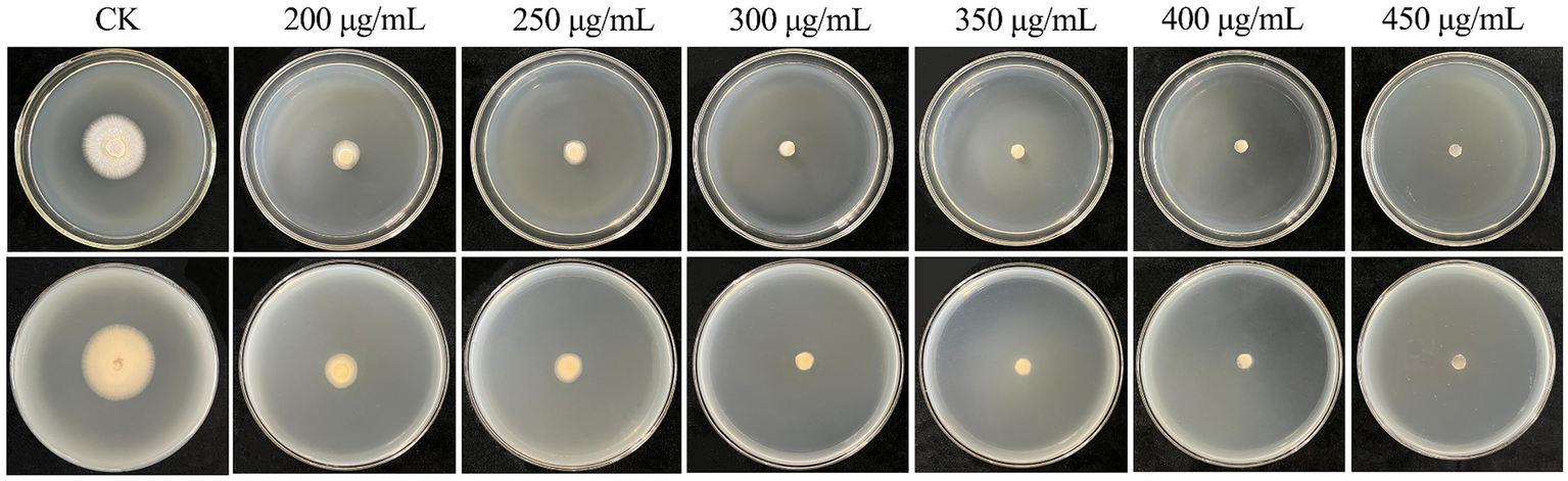 The hygromycin B is widely used as an antibiotic screening agent in fungal genetic transformation (Gritz and Davies, 1983; Ning et al., 2022; Li et al., 2023). The antibiotic sensitivity of C. chanhua strain 022017-3 was determined in PDA medium with different concentrations of hygromycin B (200, 250, 300, 350, 400, 450 μg/mL). The control group did not receive antibiotics. Petri dishes were incubated for 5 days at 24°C.