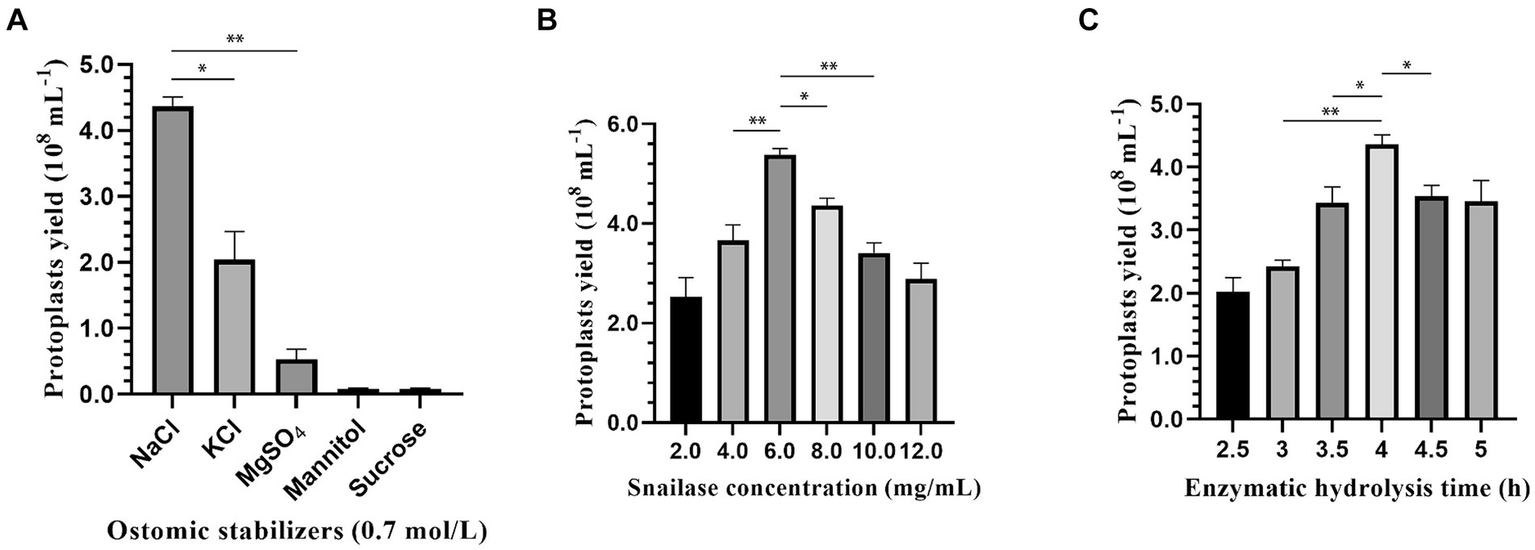 Effect of osmotic stabilizers, enzymatic hydrolysis concentration and enzymatic hydrolysis time on protoplasts preparation of strain 022017-3. (A) Osmotic stabilizers. (B) Snailase concentration. (C) Enzymatic hydrolysis time (**p < 0.01 and *p < 0.05).
