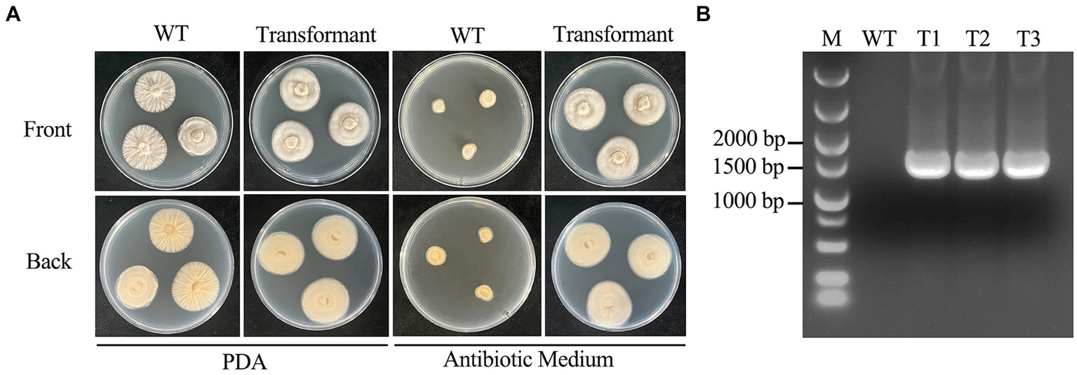 Morphological comparison of wild type strain 022017-3 with transformants and confirmation of transformants. (A) Phenotypes of wild type strain 022017-3 and transformant on PDA and antibiotic medium at 24°C for 6 days. (B) Diagnostic PCR to identify the transformants (M, Marker; WT, Wild Type; T1, Transformant 1; T2, Transformant 2; T3, Transformant 3).